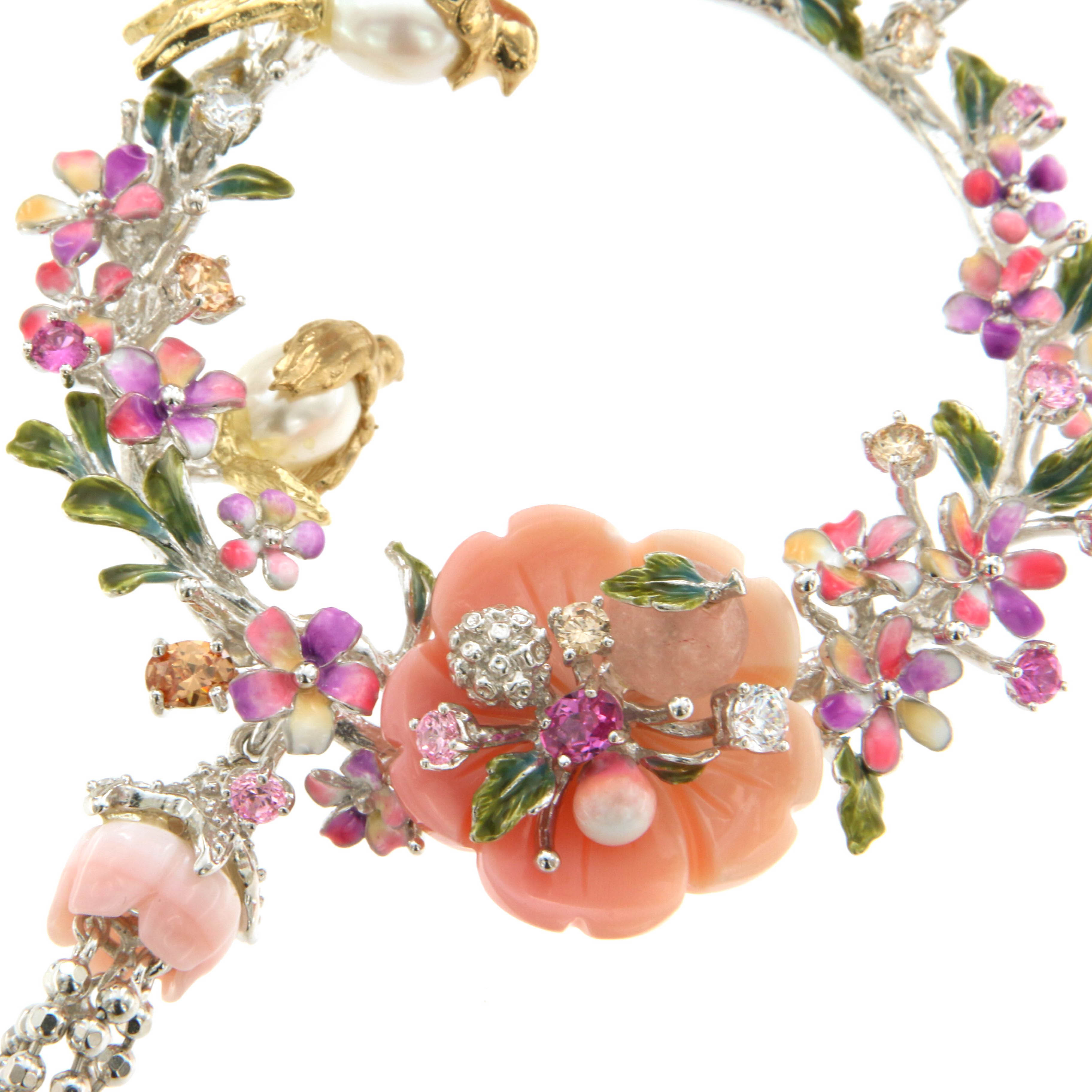 Висулка от ”Jacklin hugasian” в сребро и сребро с позлата, корал, цветен емайл, розов кварц, перли и циркони.