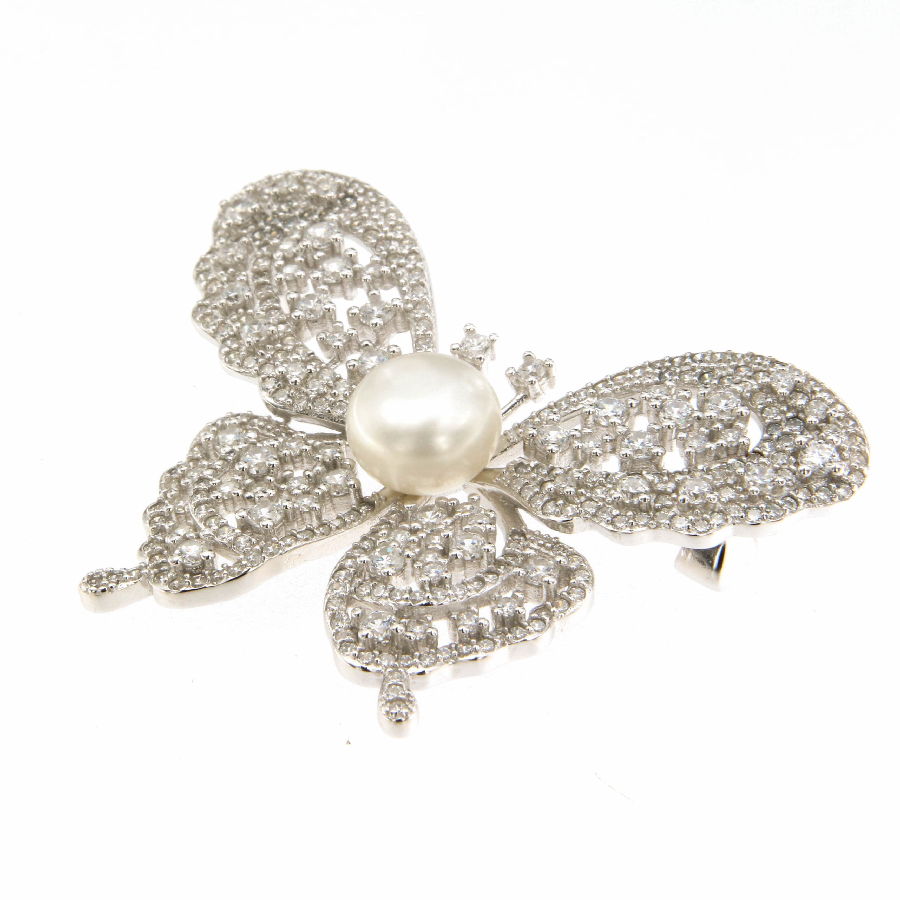 Брошка "Пеперуда" от "Jacklin hugasian" в сребро с цирконии и култивирана бяла перла. Широчина брошка 5.1 см.