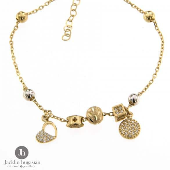 Гривна от " Jacklin hugasian " в жълто злато,мат и гланц с цирконии.Дължина гривна 17 см./ с удължител/.