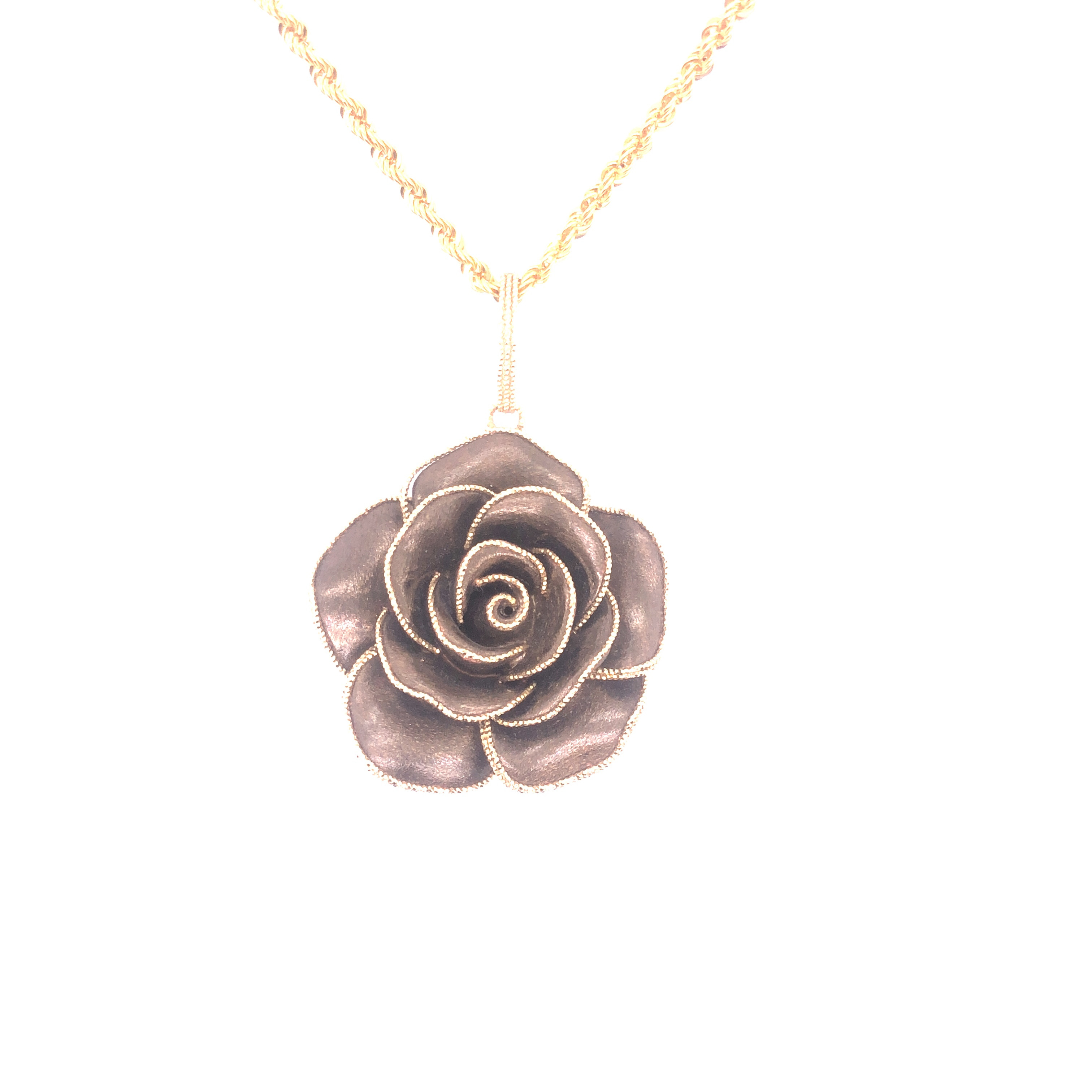 Колие от “Jacklin hugasian” в жълто и кафяво златo гланц, с лазерна шлифовка. Дължина 45 см., диаметър медальон 3.0 см. 14 К 585 Грам : 11.80 гр.