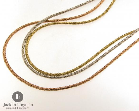 Колие от "Jacklin hugasian" в бяло, жълто и розово сребро. Дължина 40-45 см.Колието е без закопчалка. Произход Италия.