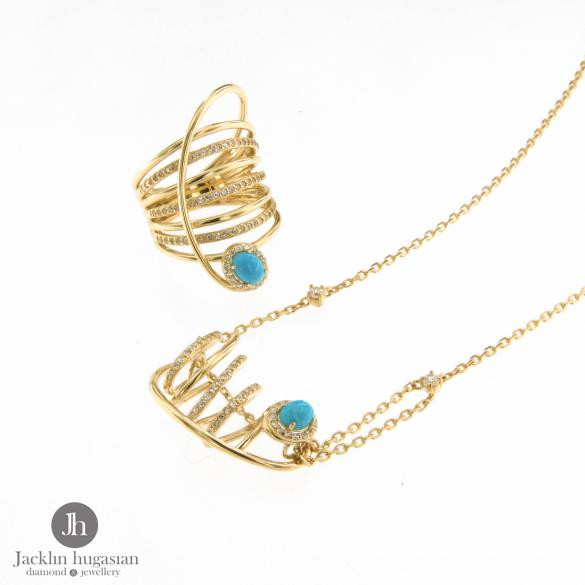 Колие от "Jacklin hugasian" в жълто злато, гланц с тюркоаз и цирконий.