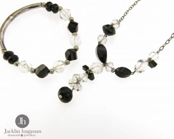 Комплект колие и гривна от "Jacklin hugasian" с бели кристали и черни оникси. Дължина колие 40 см. Диаметър гривна 5.5 см.