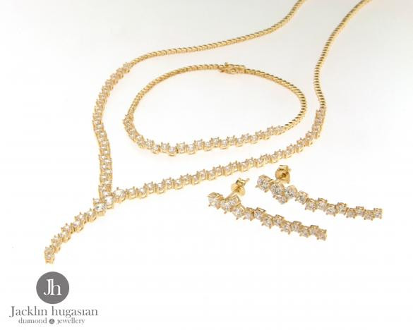 Комплект колие и обеци от "Jacklin hugasian" в жълто злато с цирконии. Дължина колие 42 см. Дължина обеци 3.7 см.