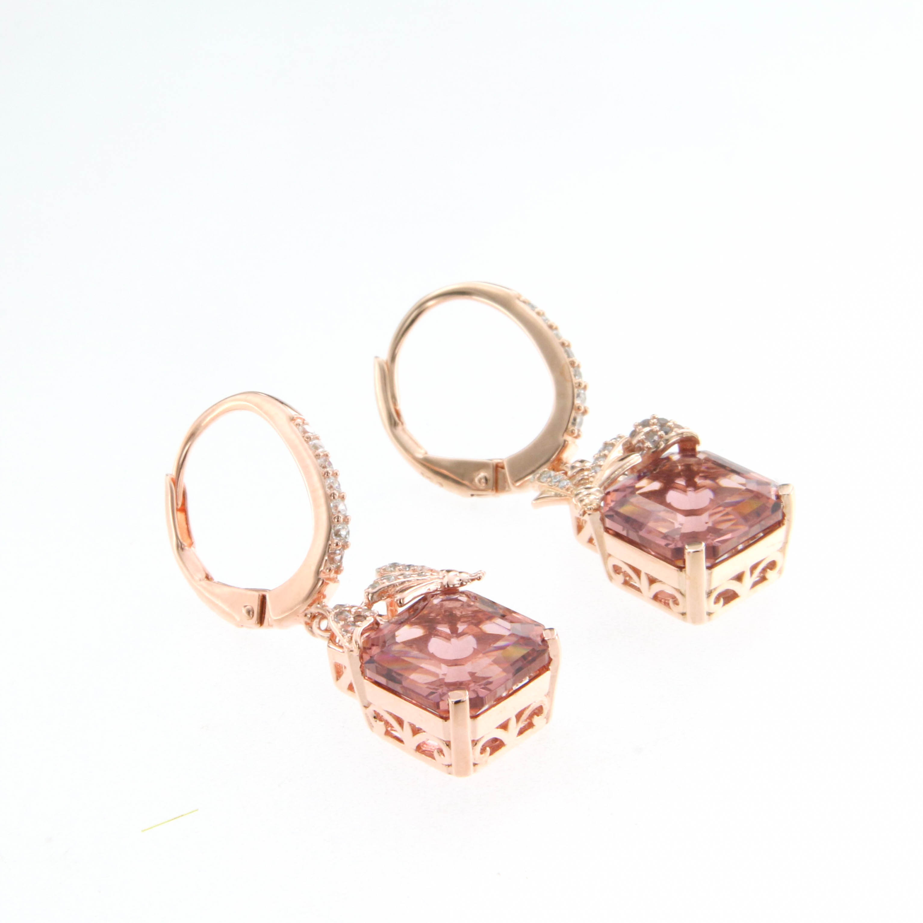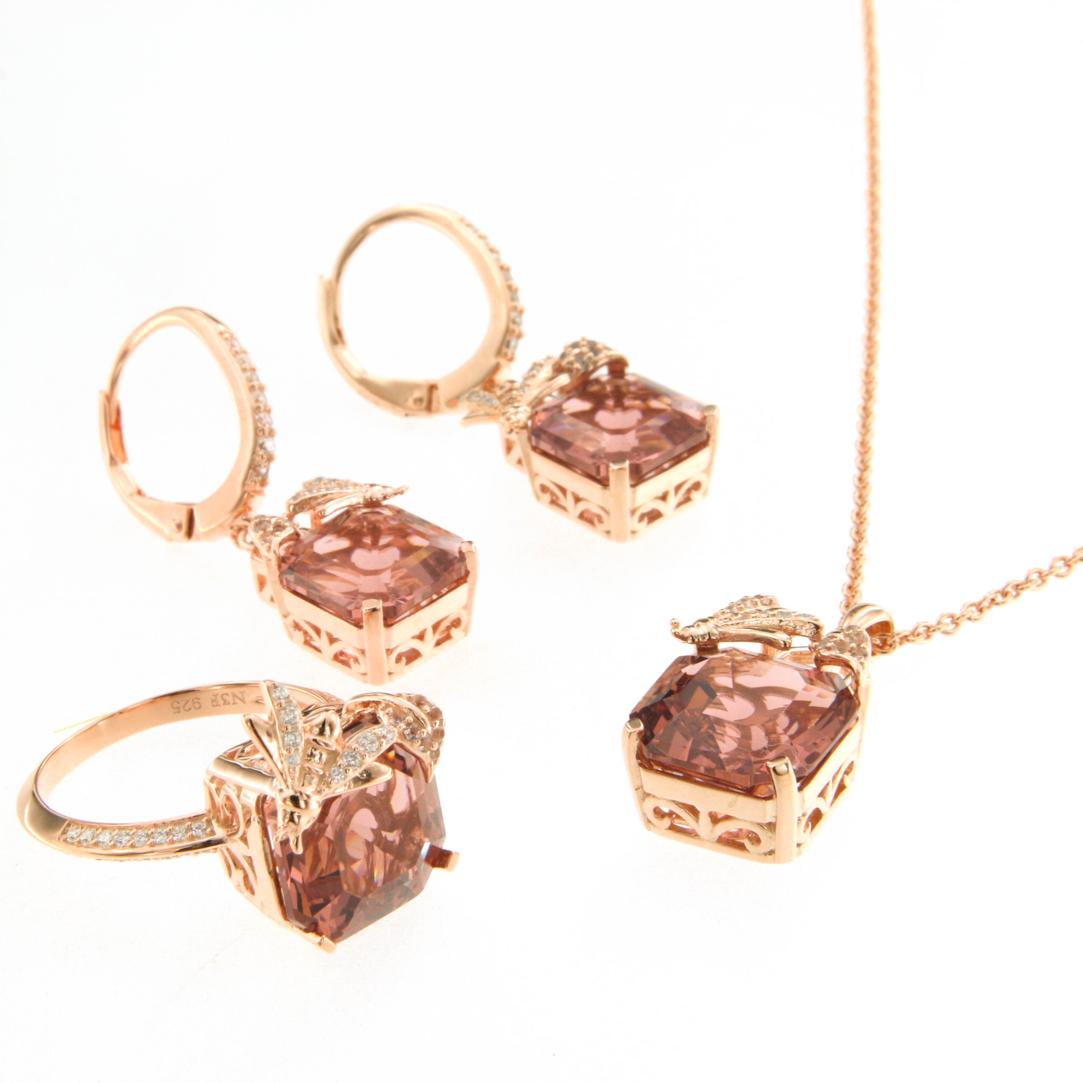 Комплект колие, обеци и пръстен от “Jacklin hugasian” в розово сребро с морганит и циркони.