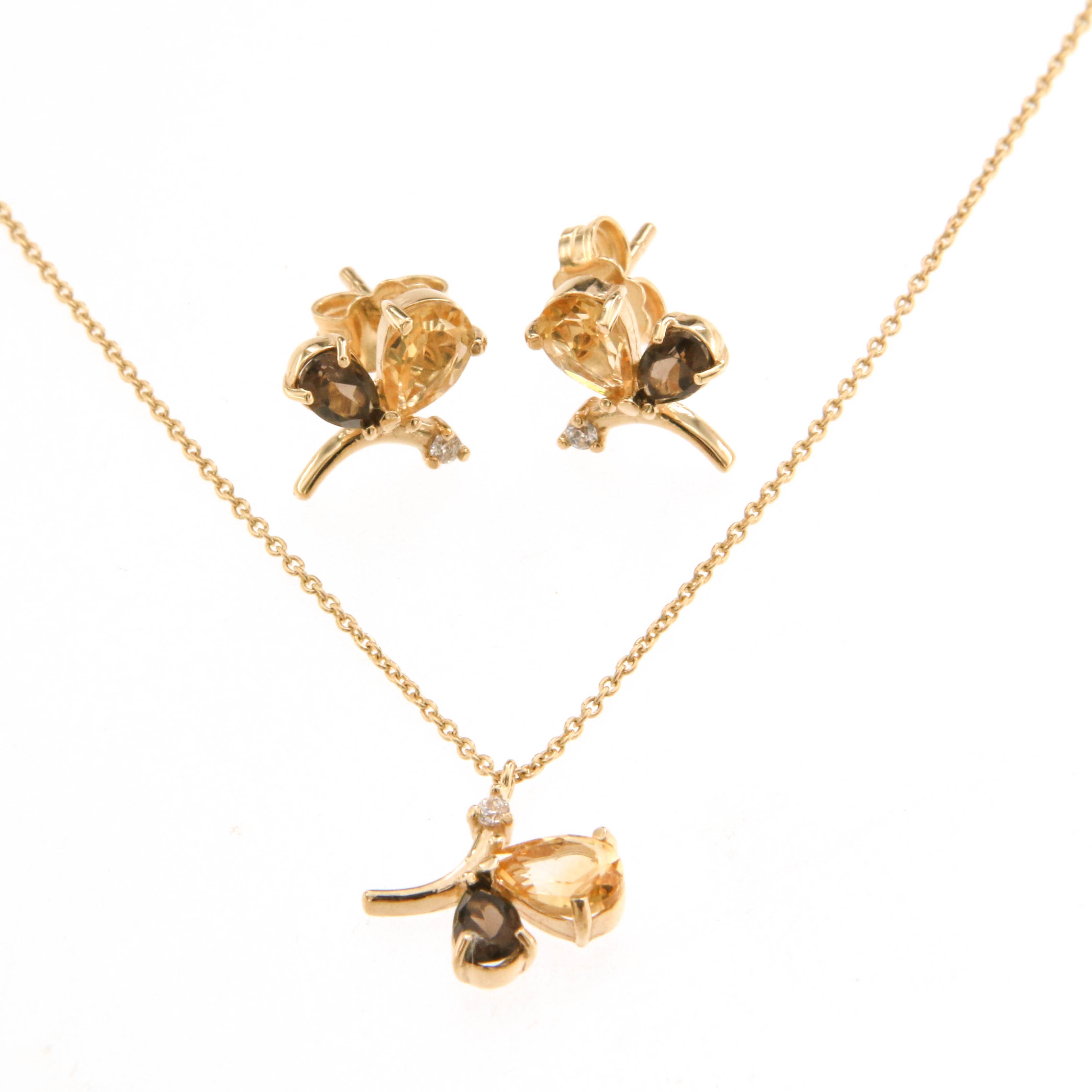 Комплект обеци и колие от “Jacklin hugasian” в жълто злато с циркон, златист и опушен топаз. Дължина обеци 1.00 см., широчина 1.00 см. Дължина колие 45 см. Произход Италия