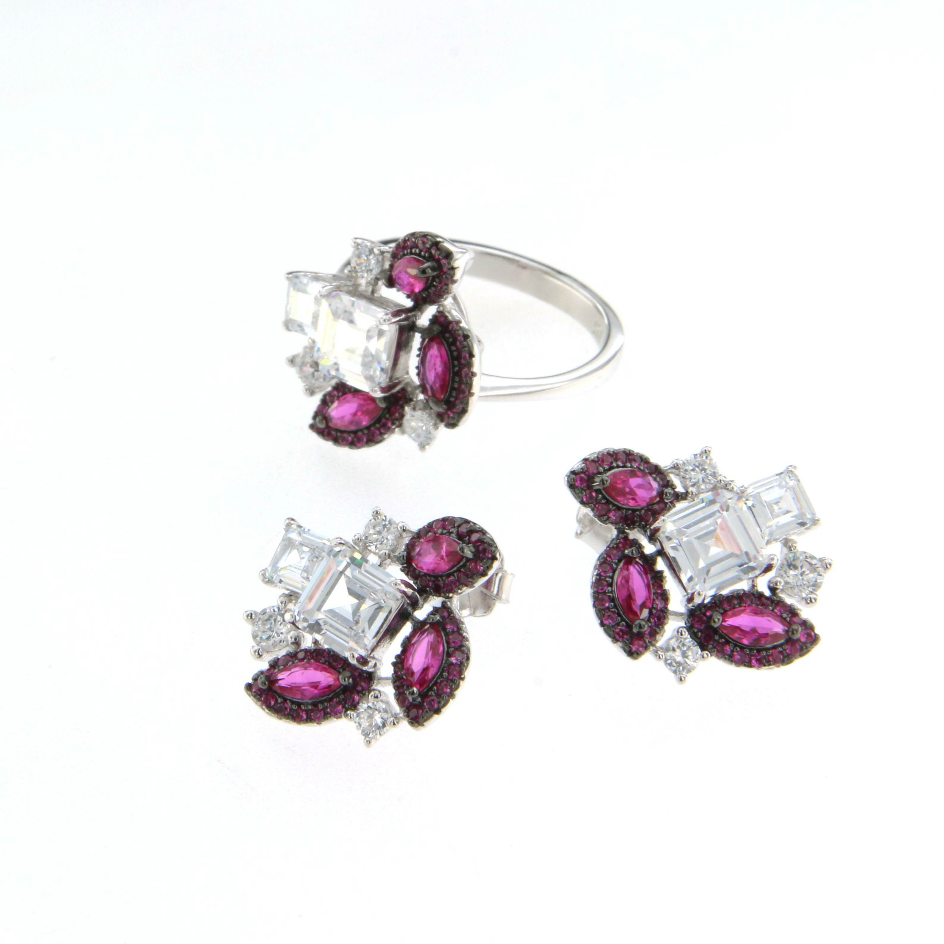 Комплект обеци и пръстен от “Jacklin hugasian” в сребро с циркони и розов турмалин.