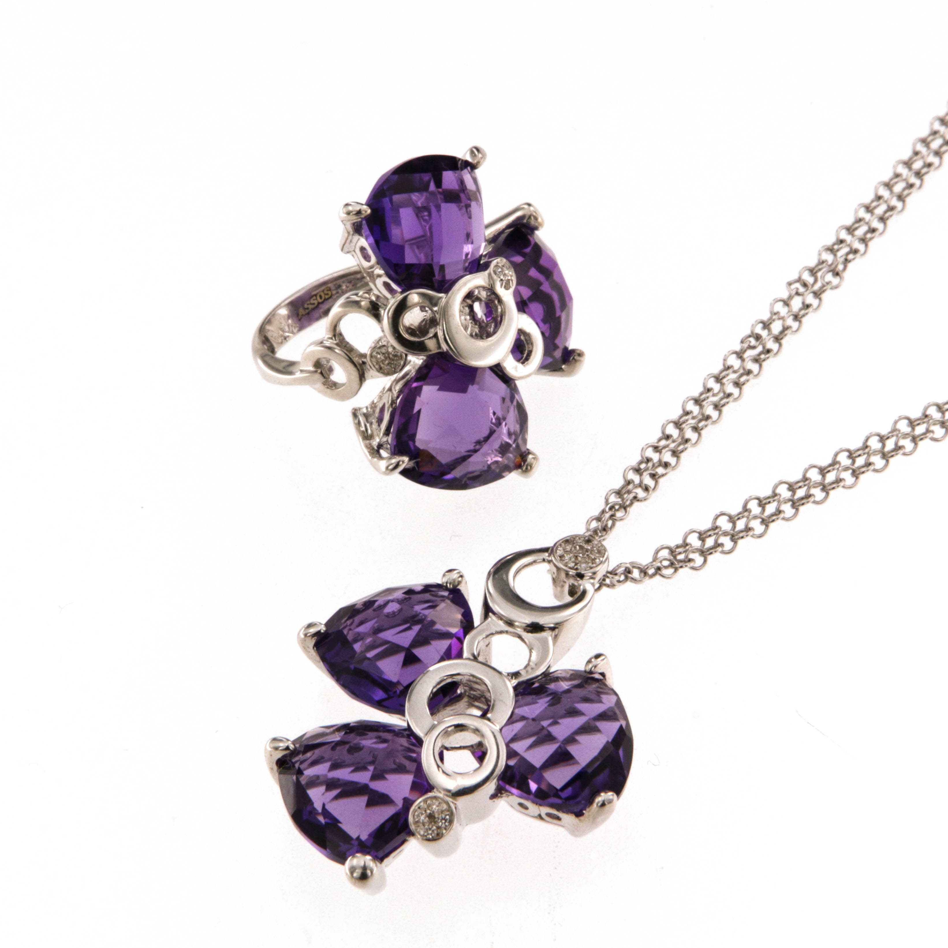 Комплект пръстен и колие от "Jacklin hugasian" в сребро с лилав аметист и цирконии. Дьлжина колие 23см.