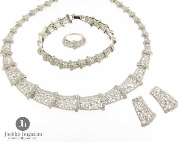 Комплект пръстен,колие,гривна и обеци от " Jacklin hugasian " в сребро с циркони.