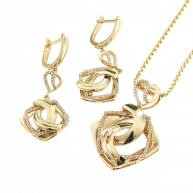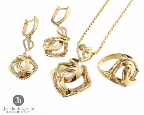 Комплект пръстен,обеци и висулка от " Jacklin hugasian " в жълто злато,гланц с цирконии.Дължина обеци 4.4 см.,широчина обеци 1.7 см.Дължина висулка 3.7 см.,широчина 2.7 см.
