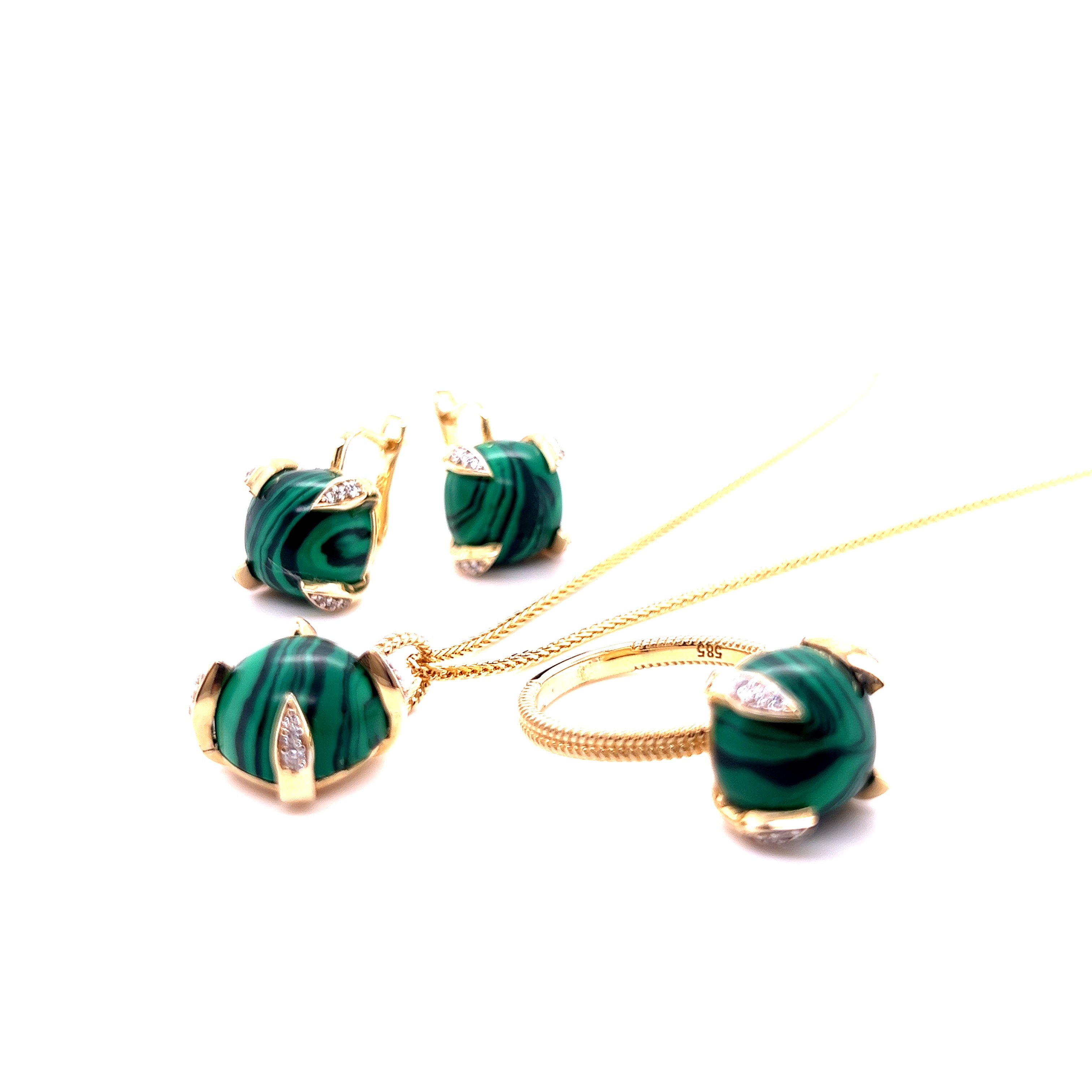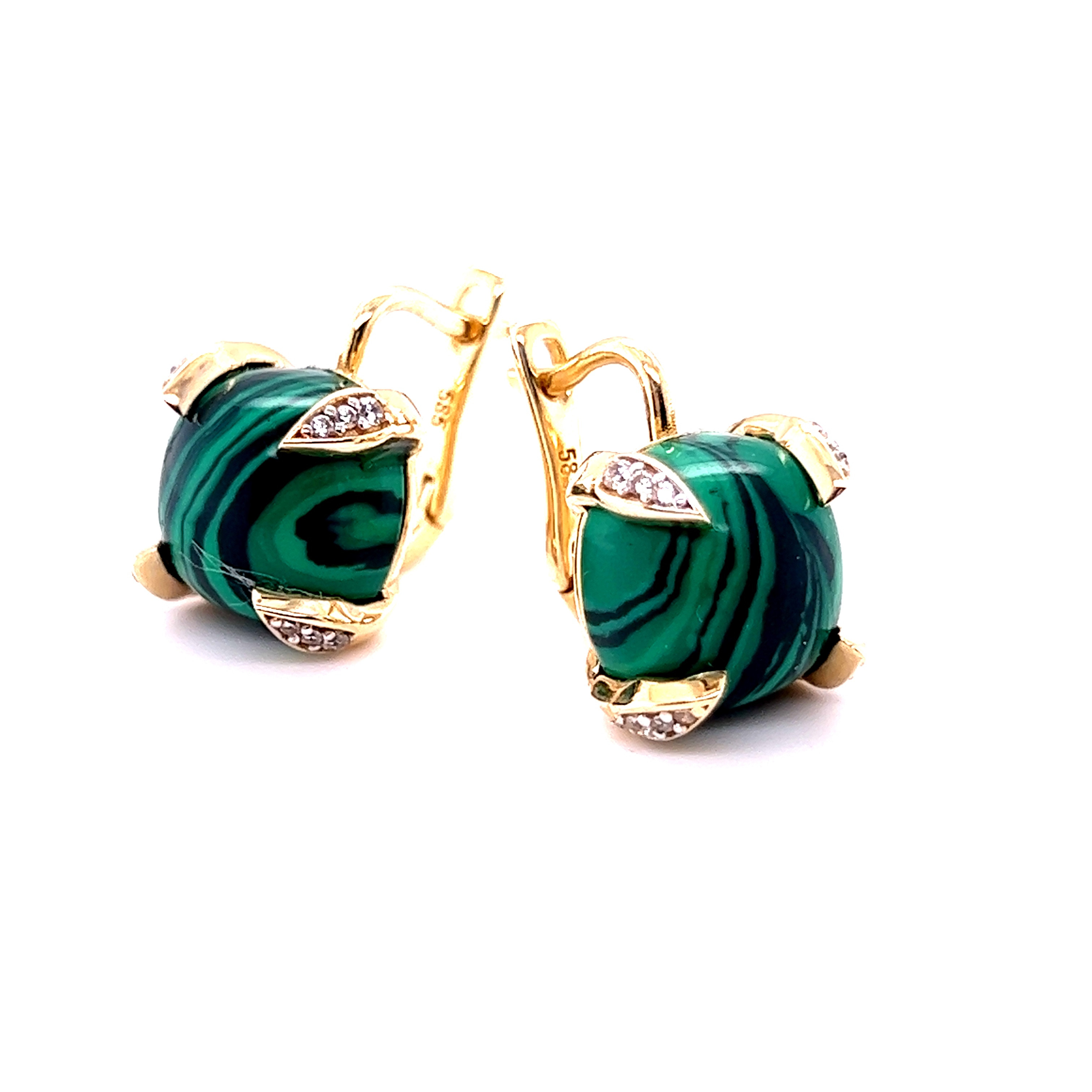 Обеци от " Jacklin hugasian " в жълто злато с малахит и цирконии.