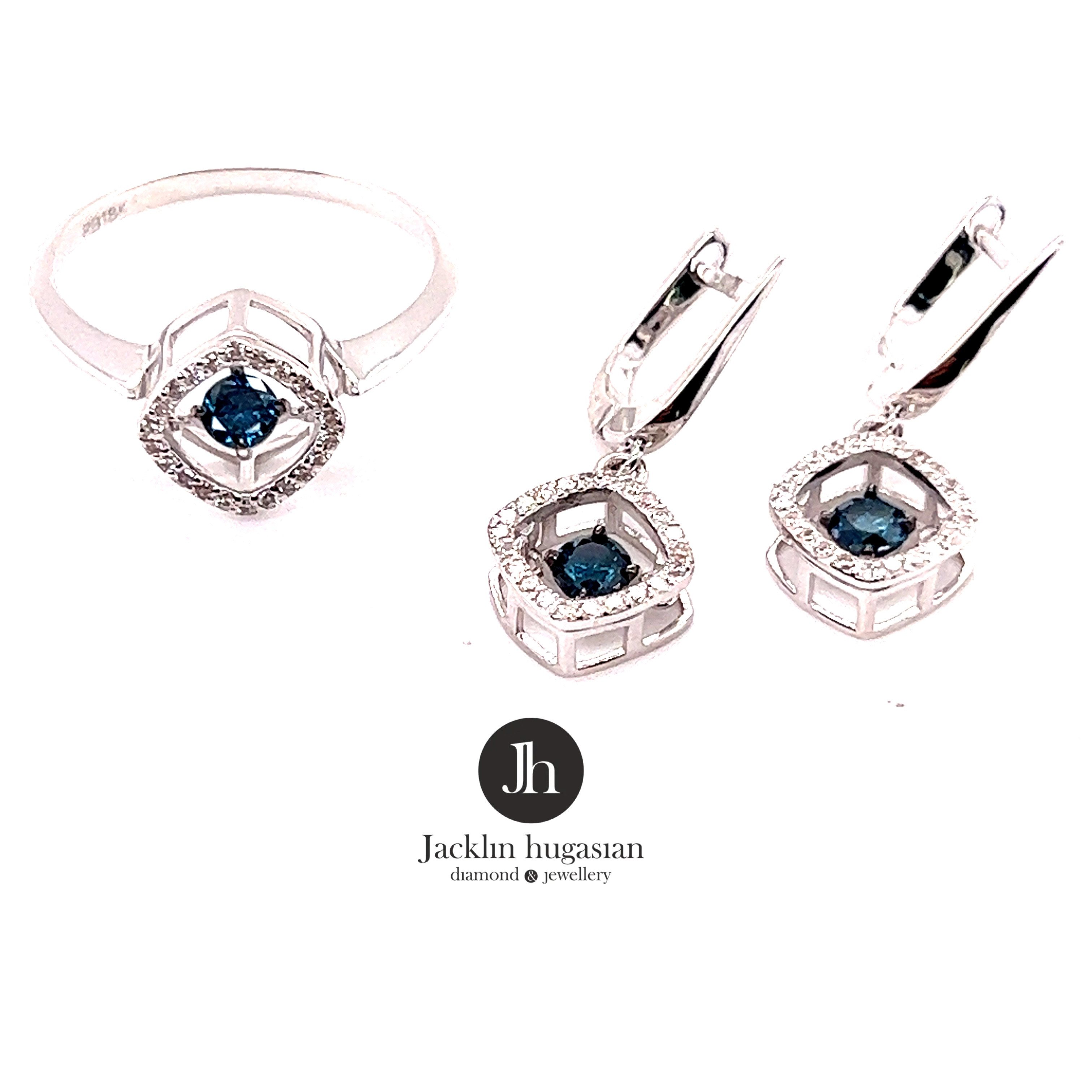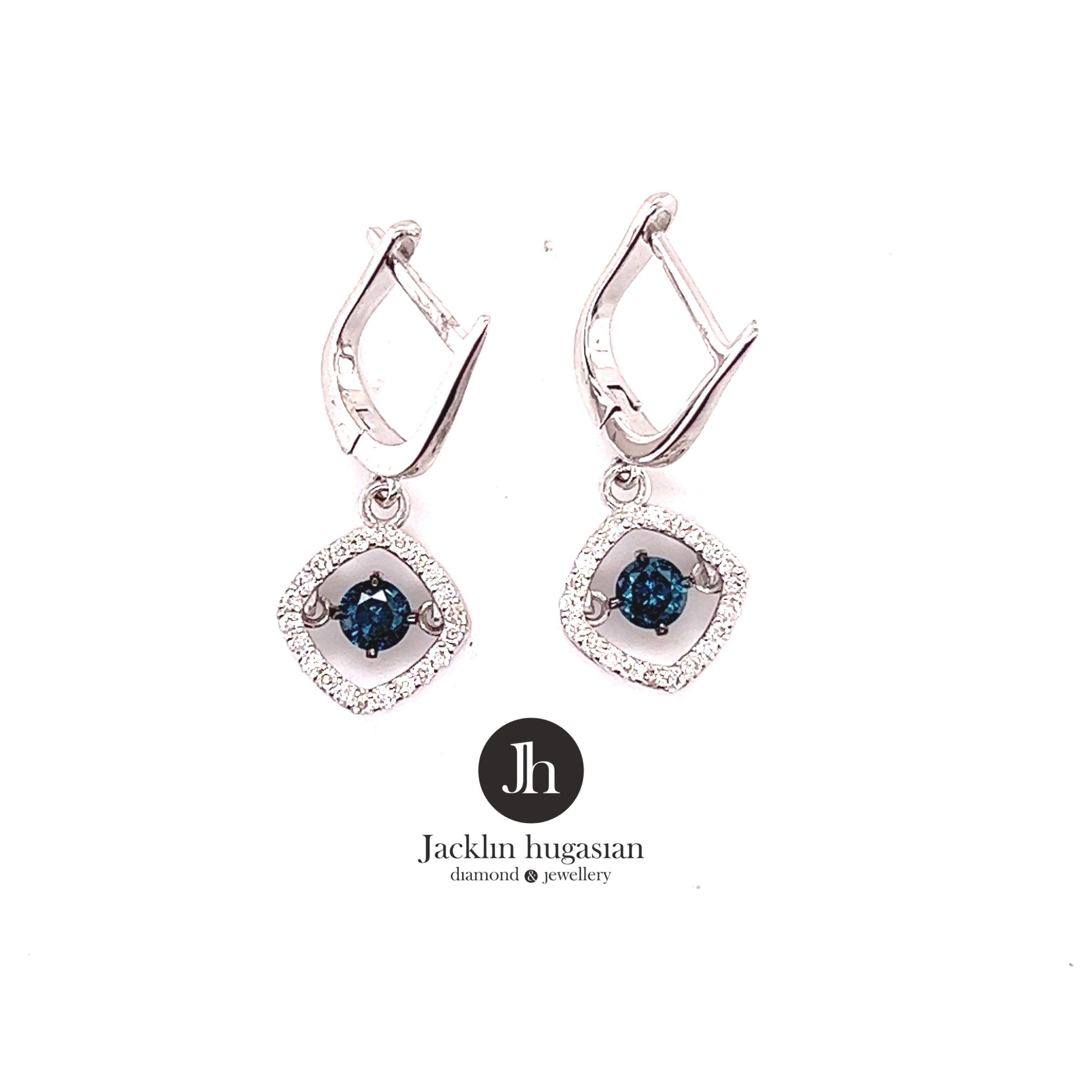 Обеци от “Jacklin hugasian” в бяло злато със сини и бели диаманти.