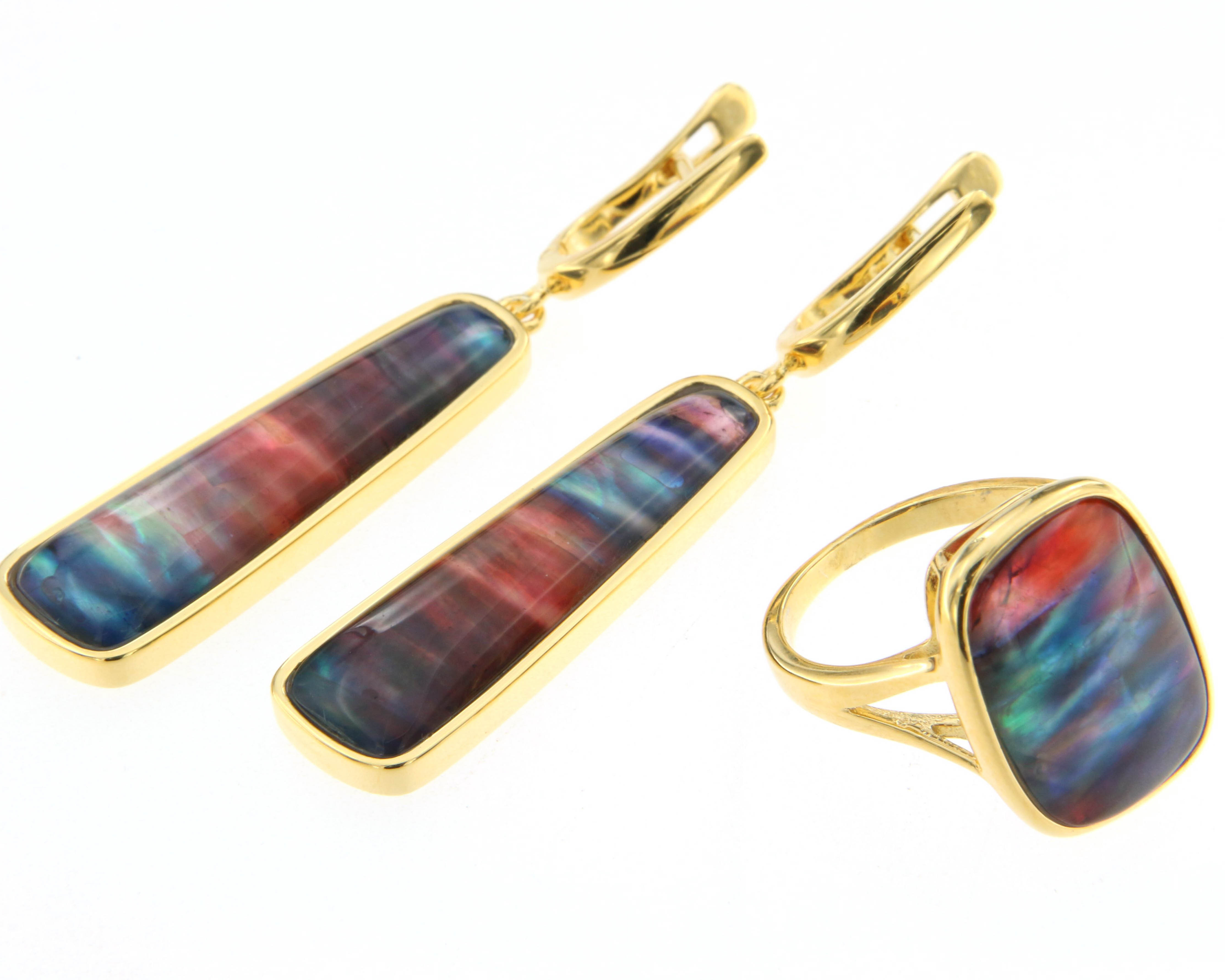 Обеци и пръстен от "Jacklin hugasian" в сребро с позлата и камък "Мезонит"
