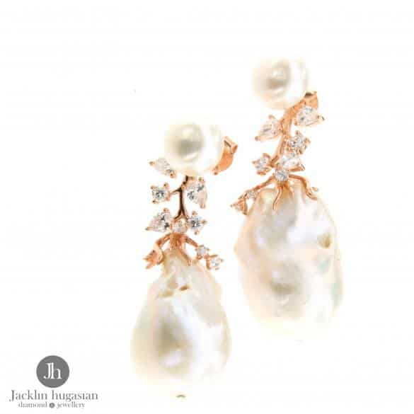 Обеци от " Jacklin hugasian " в розово сребро с циркони и перли.