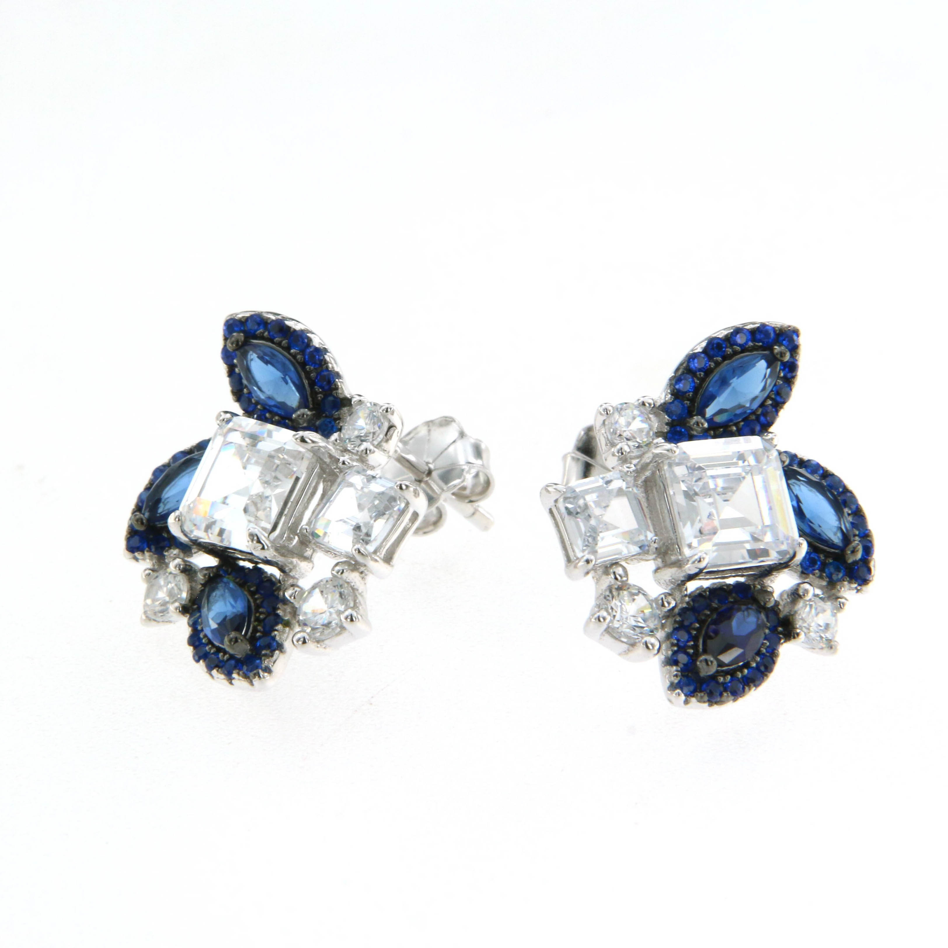 Обеци от “Jacklin hugasian” в сребро с цирконии и тъмно син сапфир. Дължина обеци 2.00 см., широчина 1.5 см.