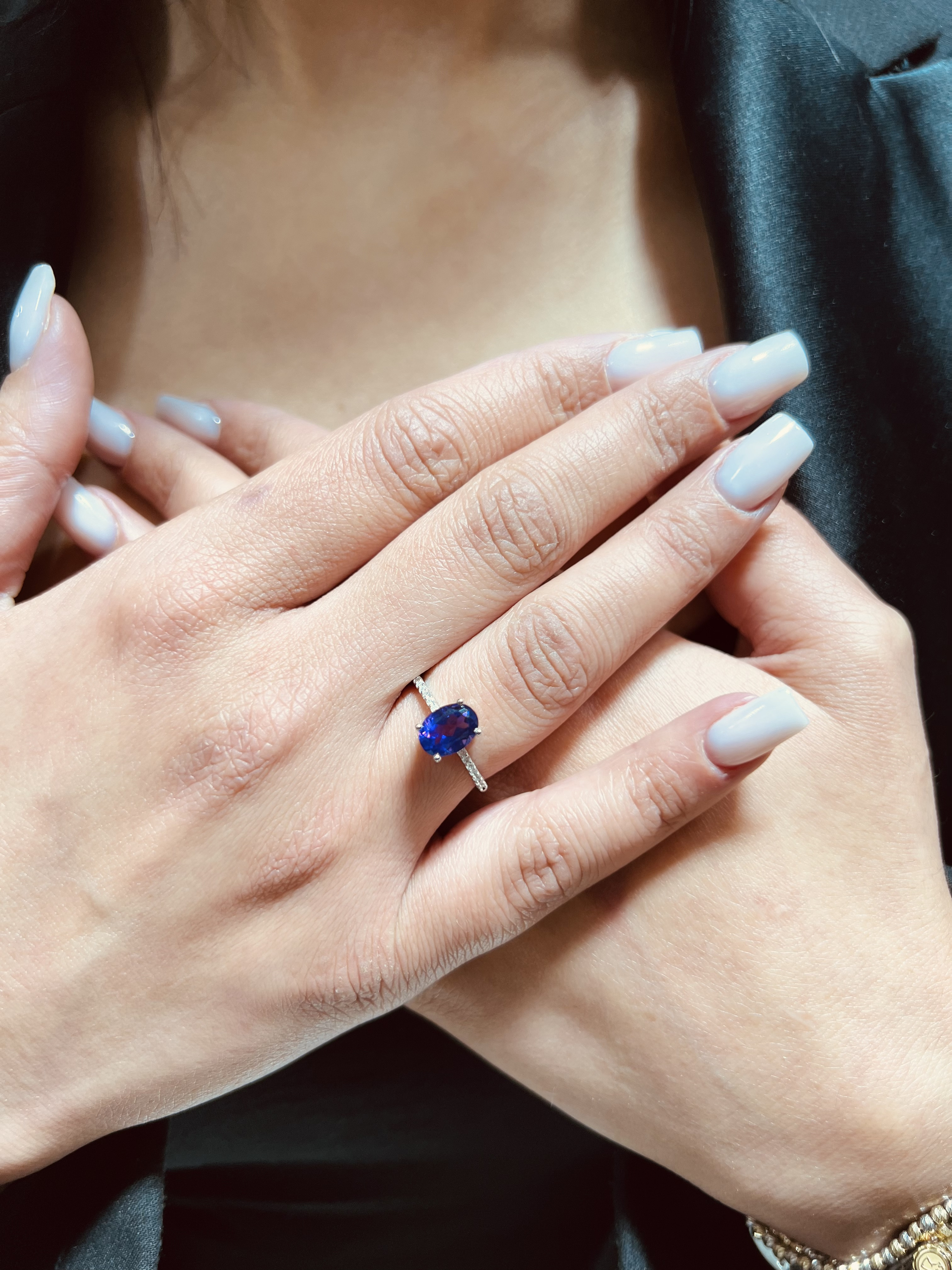 Пръстен от “Jacklin hugasian” в жълто злато с сапфир и диаманти.