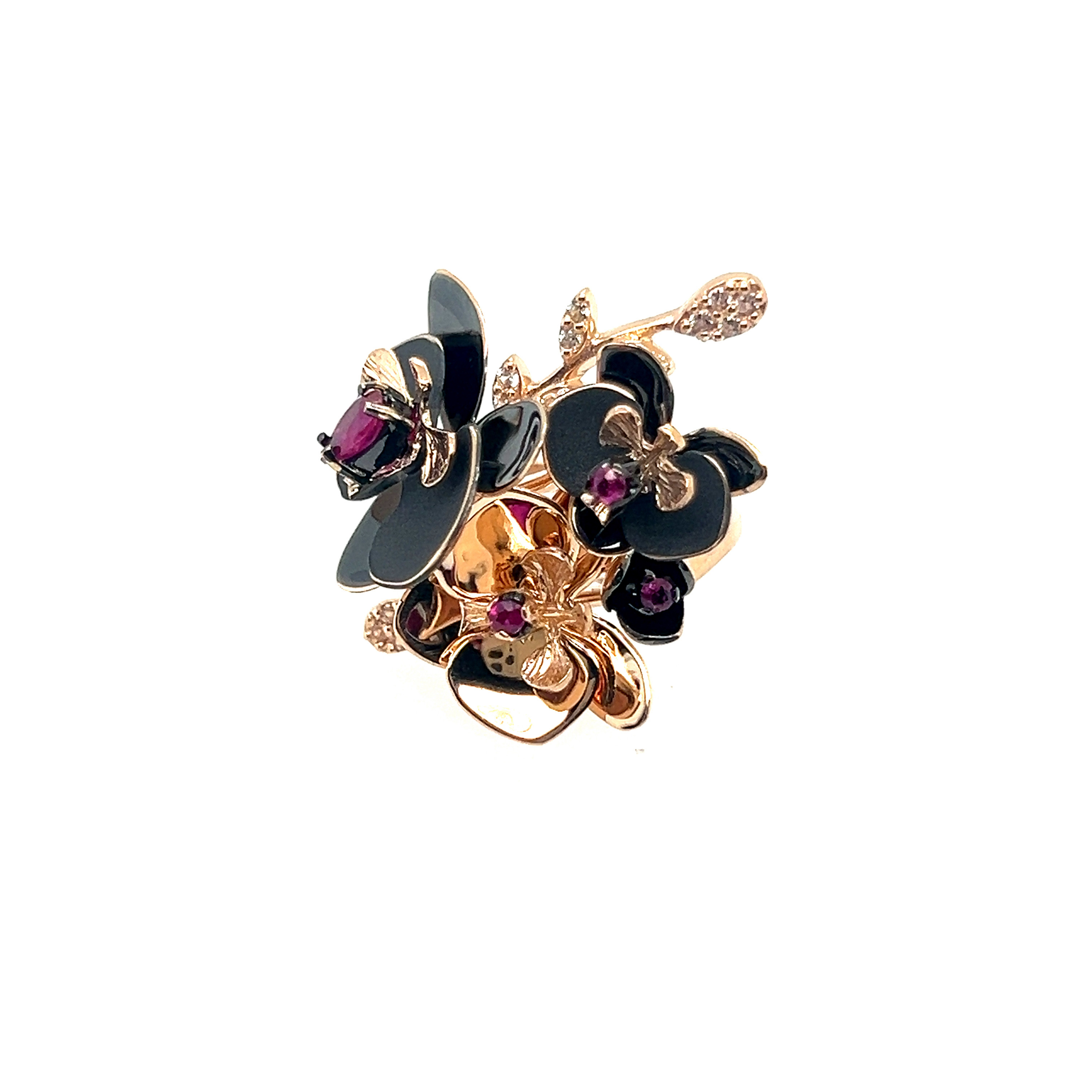 Пръстен от “Jacklin hugasian” в розово и черно злато с рубин.