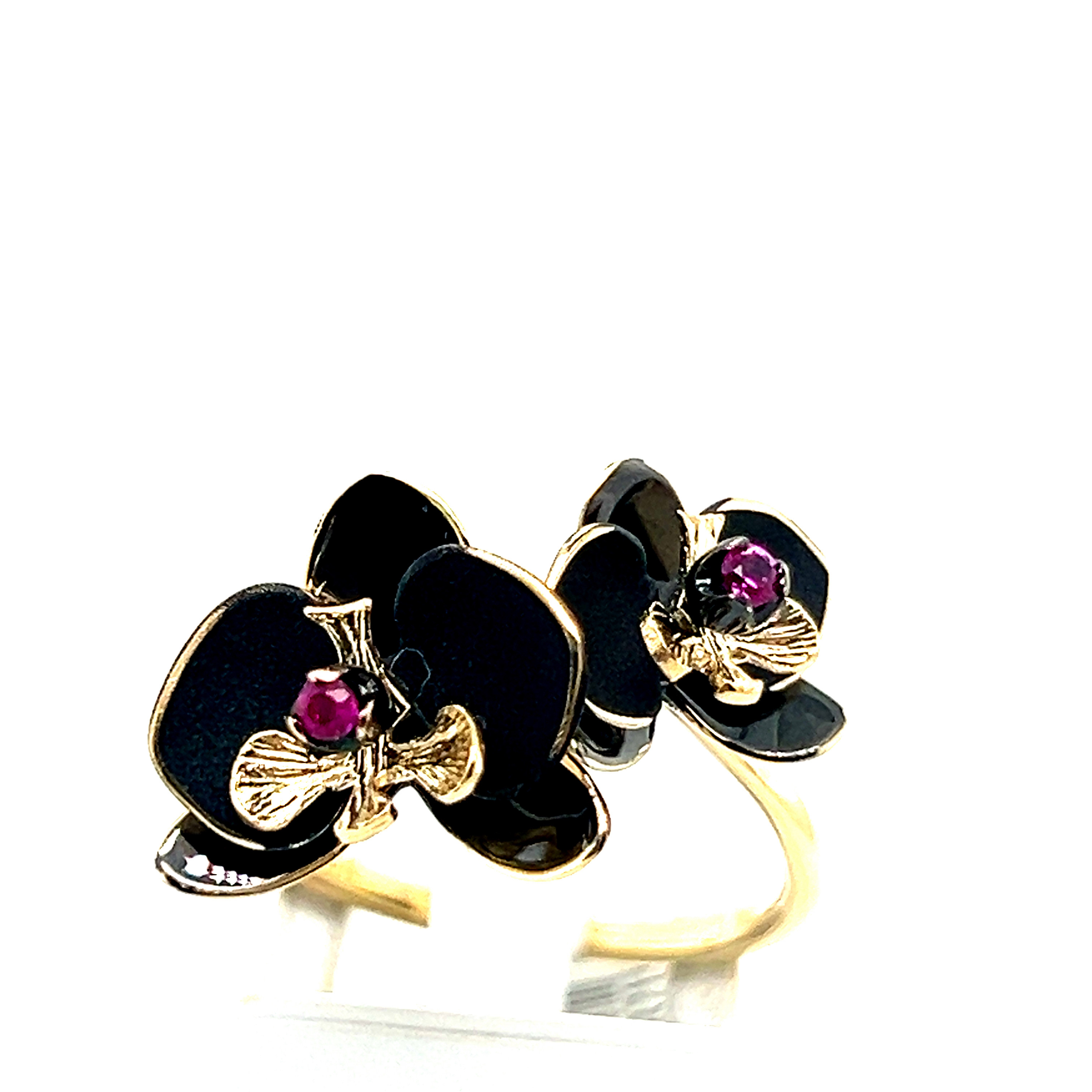 Пръстен от “Jacklin hugasian” в жълто и черно злато с рубин.