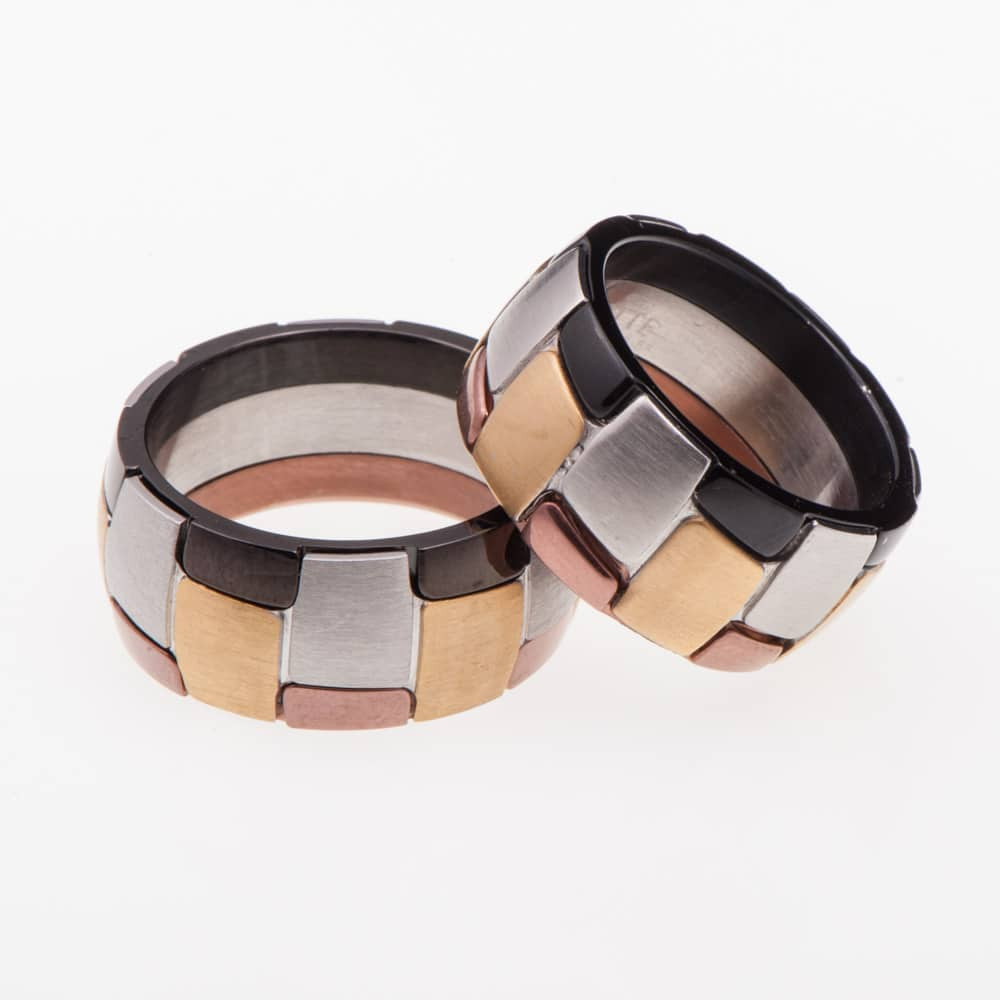 Пръстен от "Jacklin hugasian" стомана с жълта и розова позлата и черна керамика.