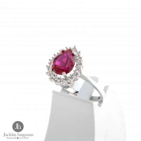 Пръстен от "Jacklin hugasian" в бяло злато с червен рубин и циркони.