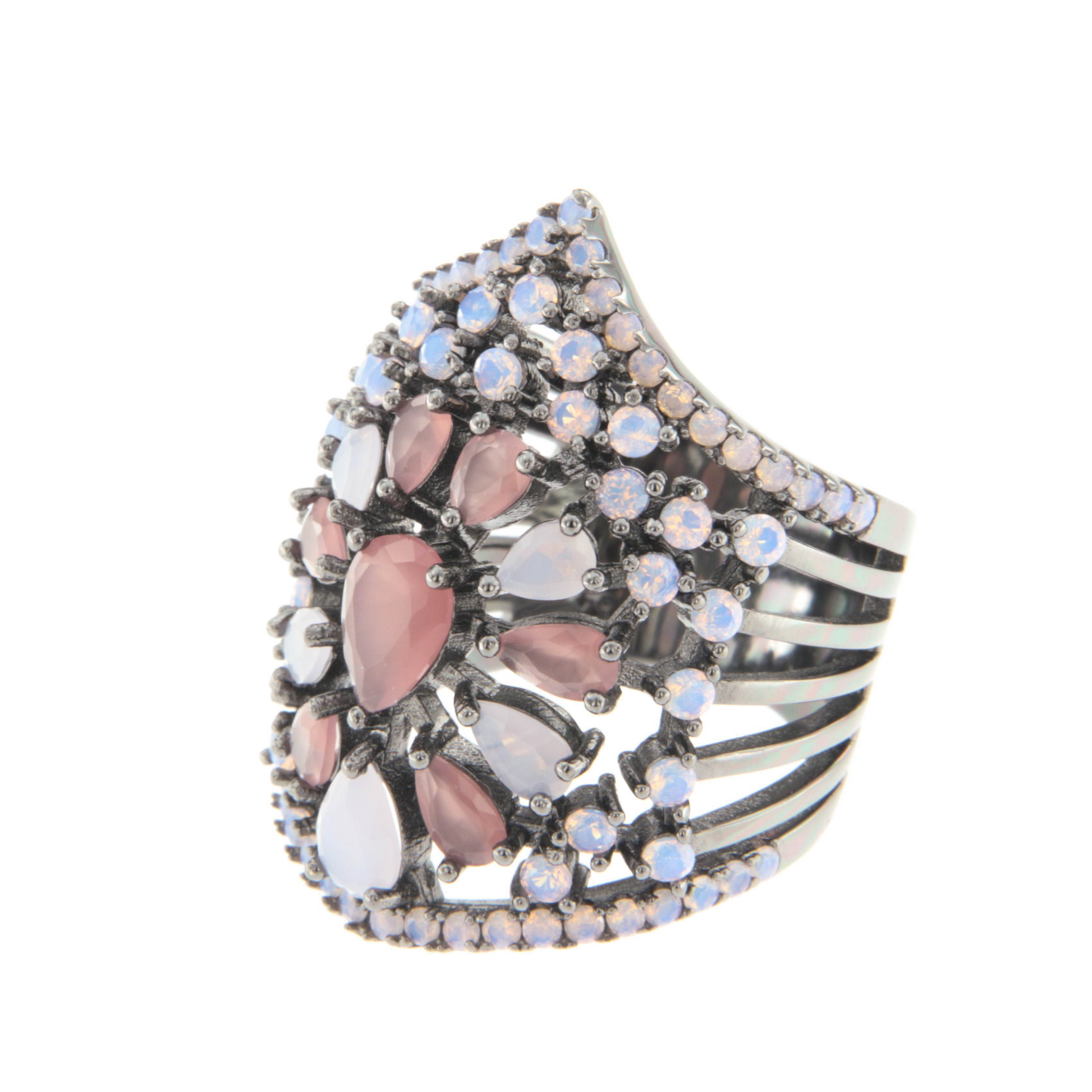 Пръстен от "Jacklin hugasian" в оксидирано сребро с лунен камък, опал и розов кварц.