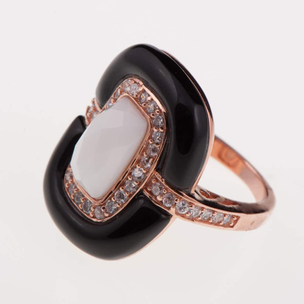 Пръстен от "Jacklin hugasian" в розово сребро с оникс, цирконии и бял ахат.