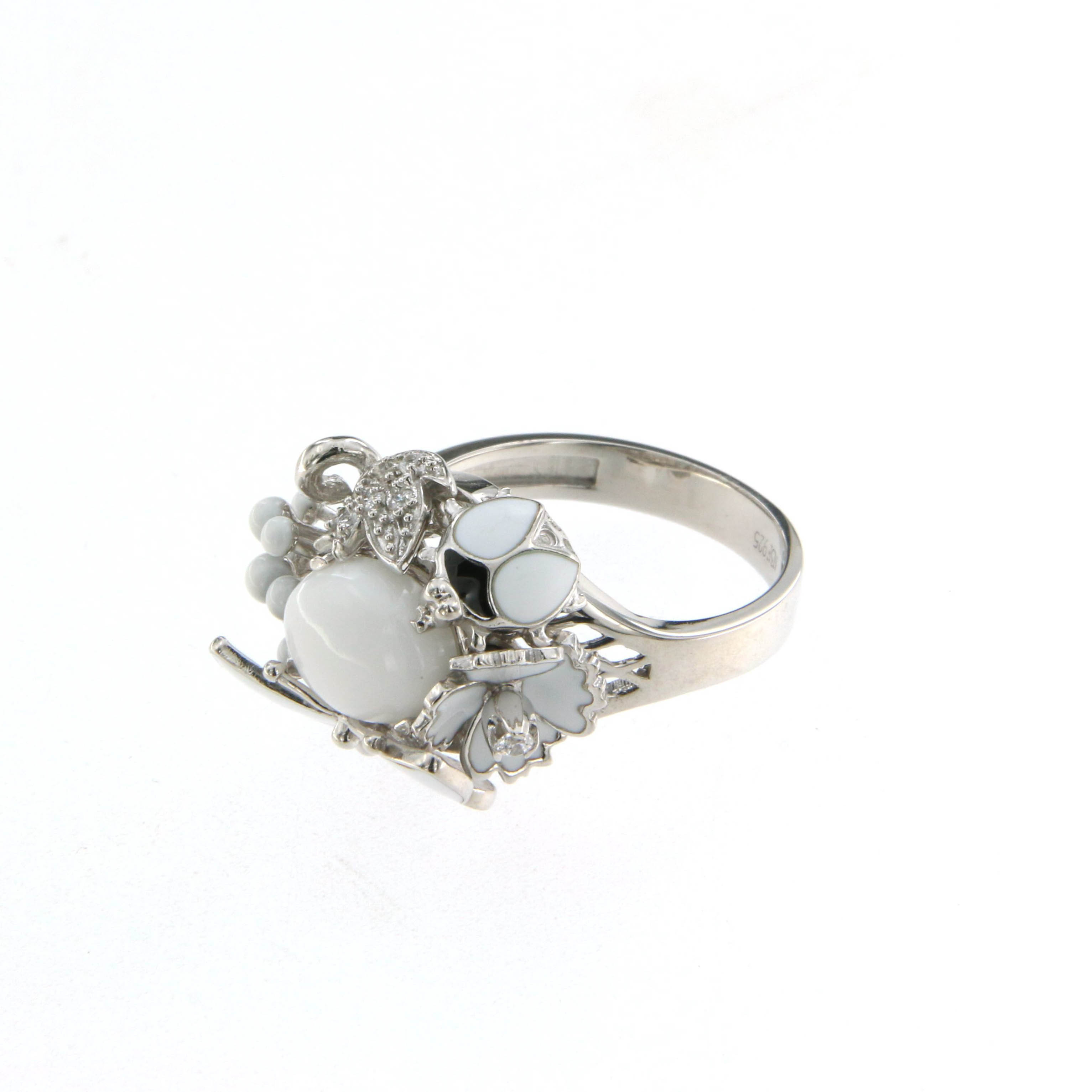 Пръстен от "Jacklin hugasian" в сребро с бял ахат, цветен емайл и циркони. Колекция "Roberto Bravo"