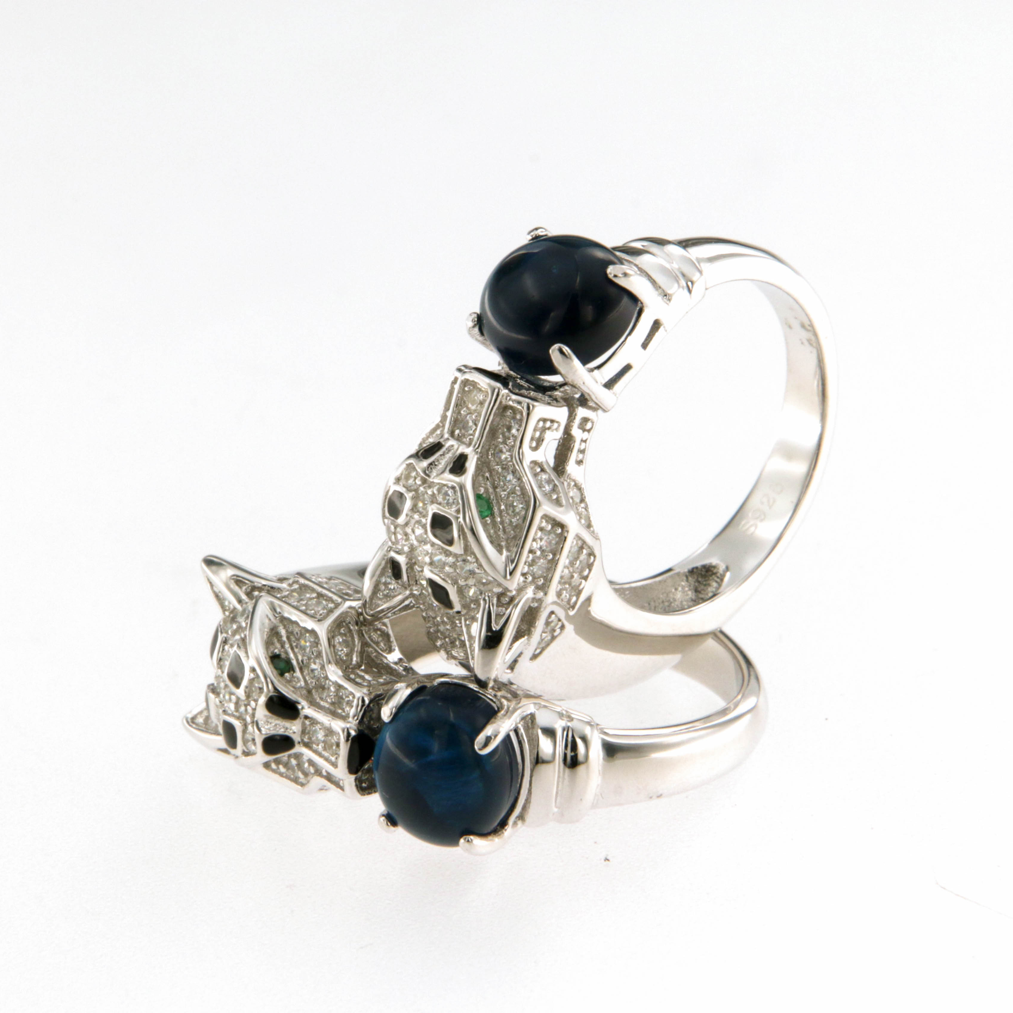 Пръстен от "Jacklin hugasian" в сребро с цирконии, тъмно син сапфир, черени оникси и зелен изумруд.