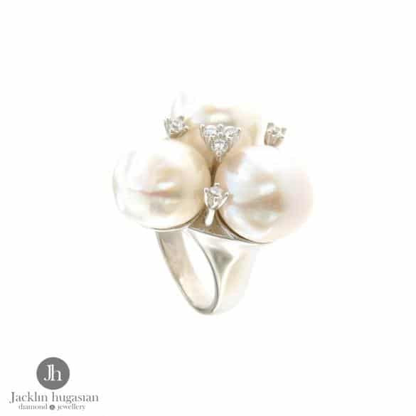 Пръстен от "Jacklin hugasian" в сребро с култивирани бели перли и цирконии.
