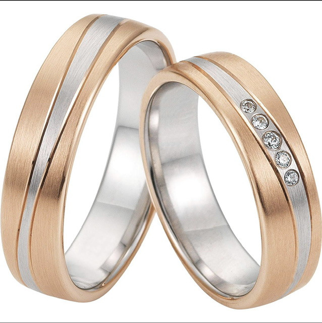 Венчални халки от "Jacklin hugasian" в бяло и розово злато с циркони