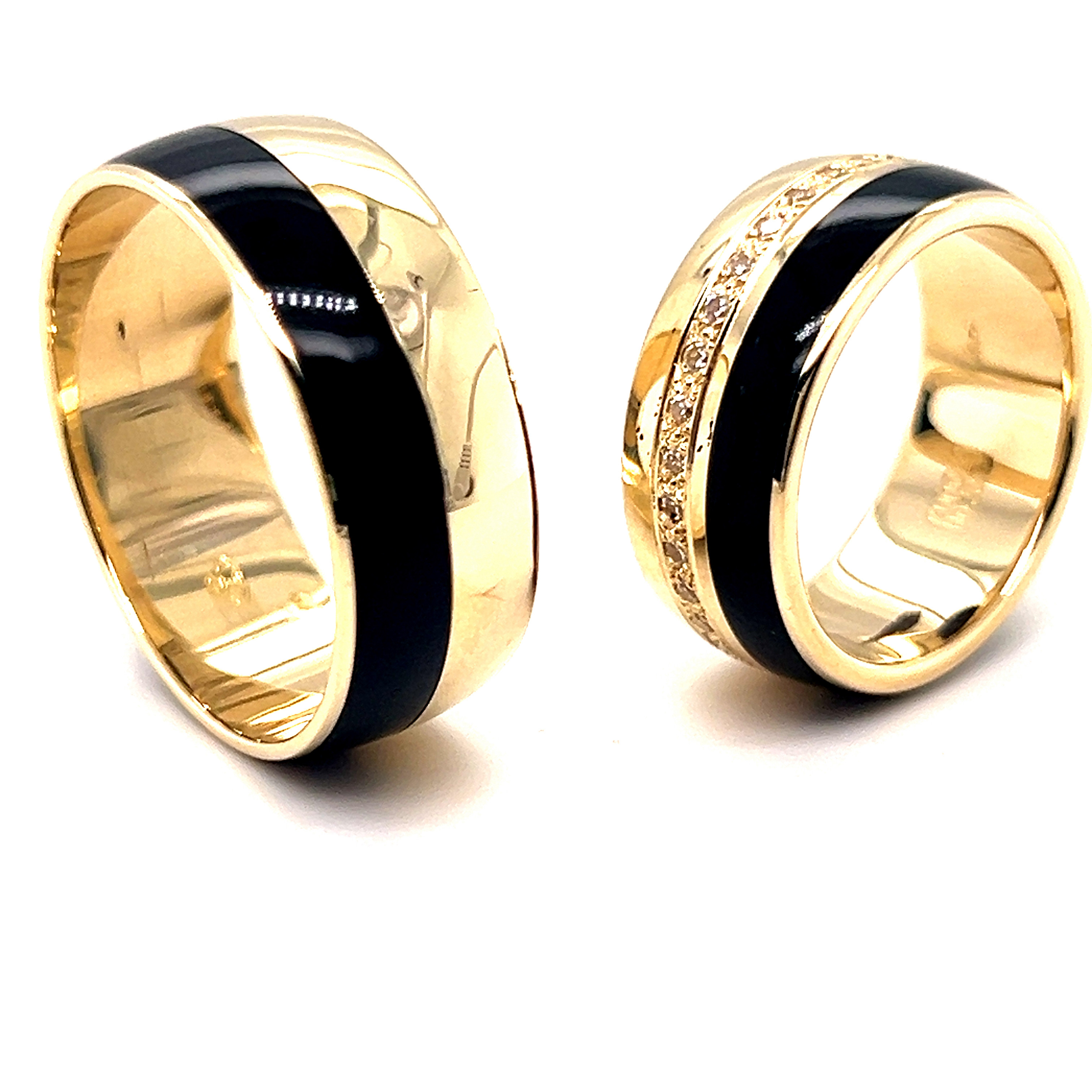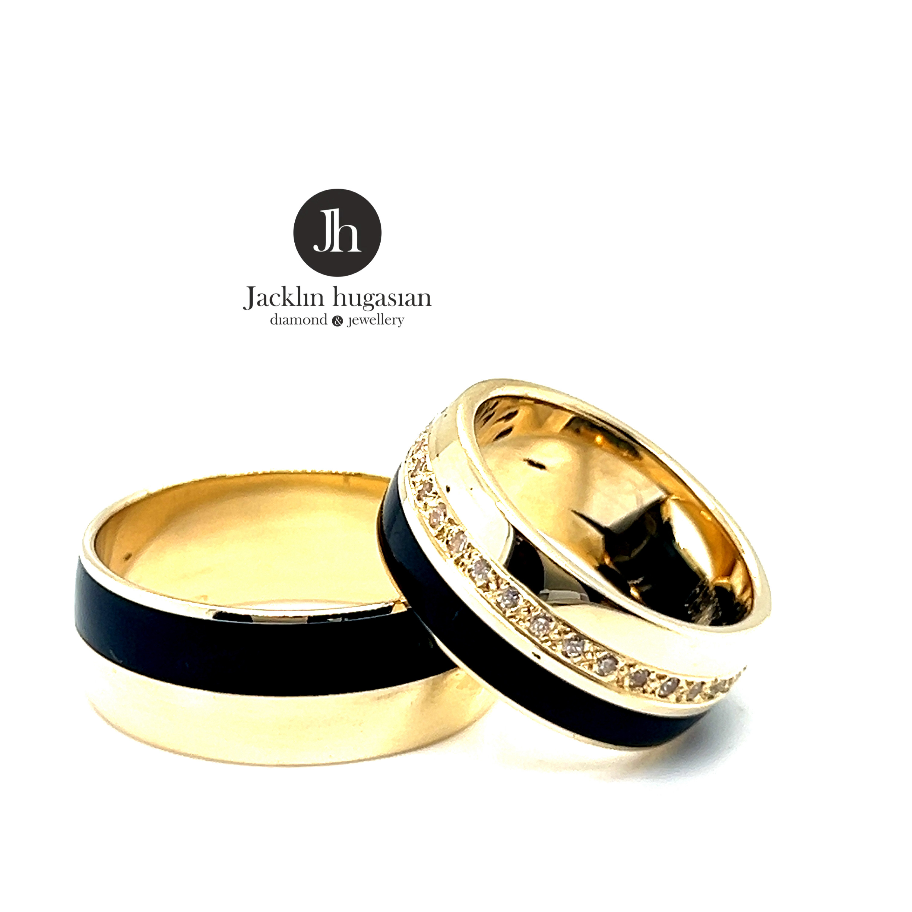 Венчални халки от "Jacklin hugasian" жълто злато с цирконии и оникс - гланц.