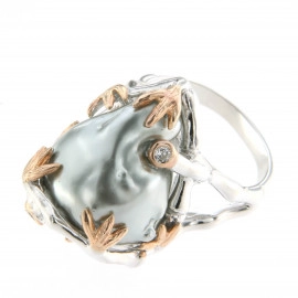 Пръстен от "Jacklin " в бяло и розово сребро със сива перла и цирконии