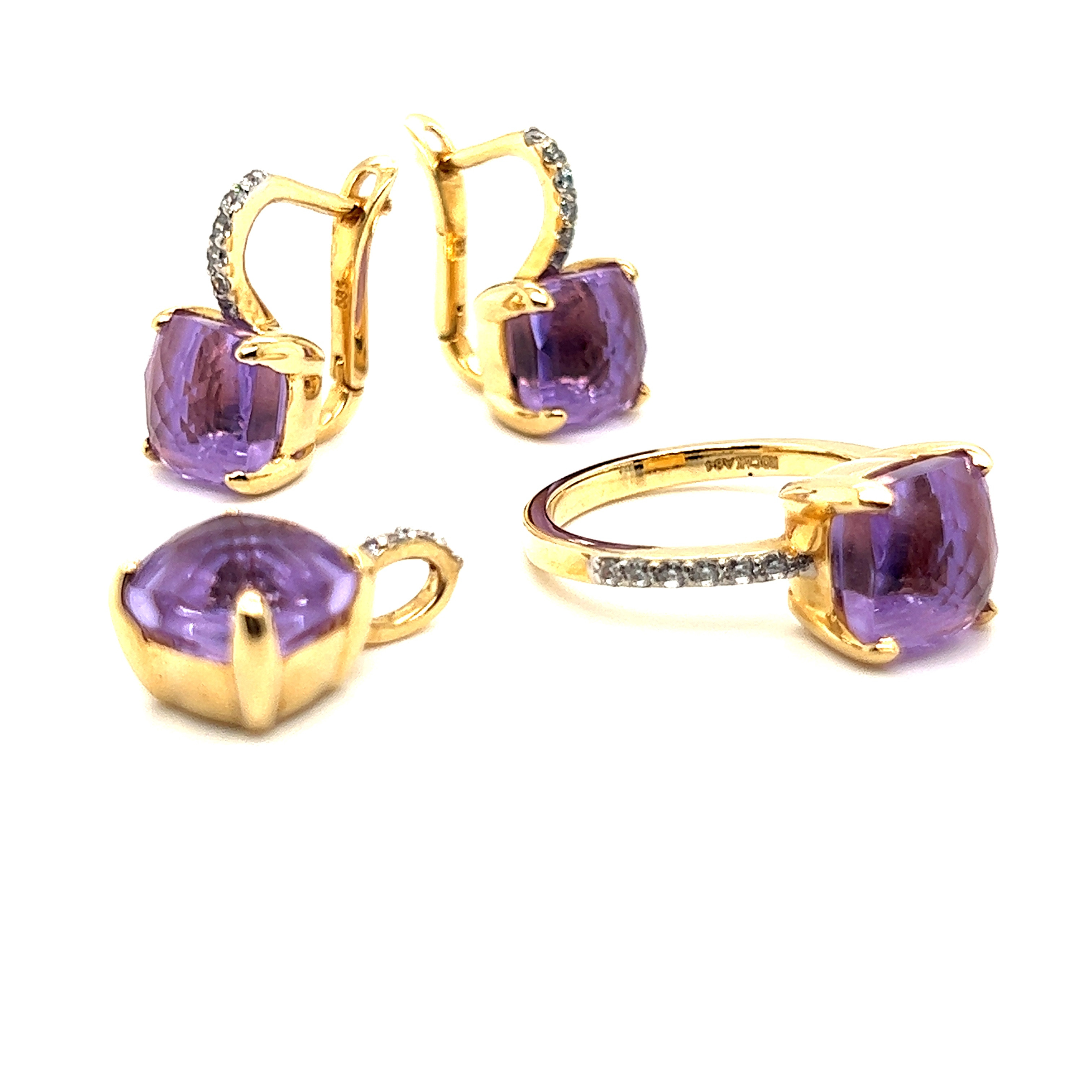 Комплект от “Jacklin hugasian” в жълто злато с аметист и цирконии.
