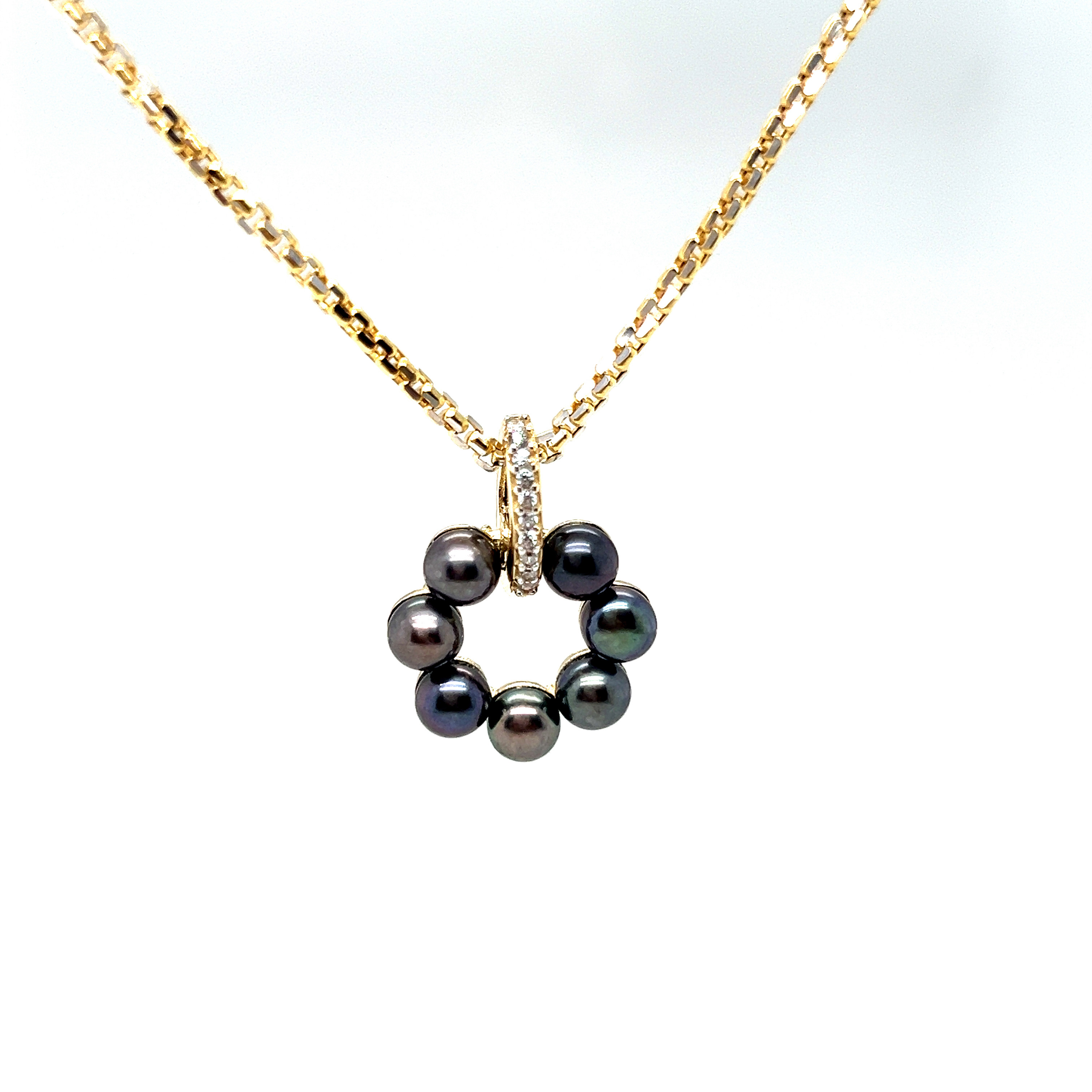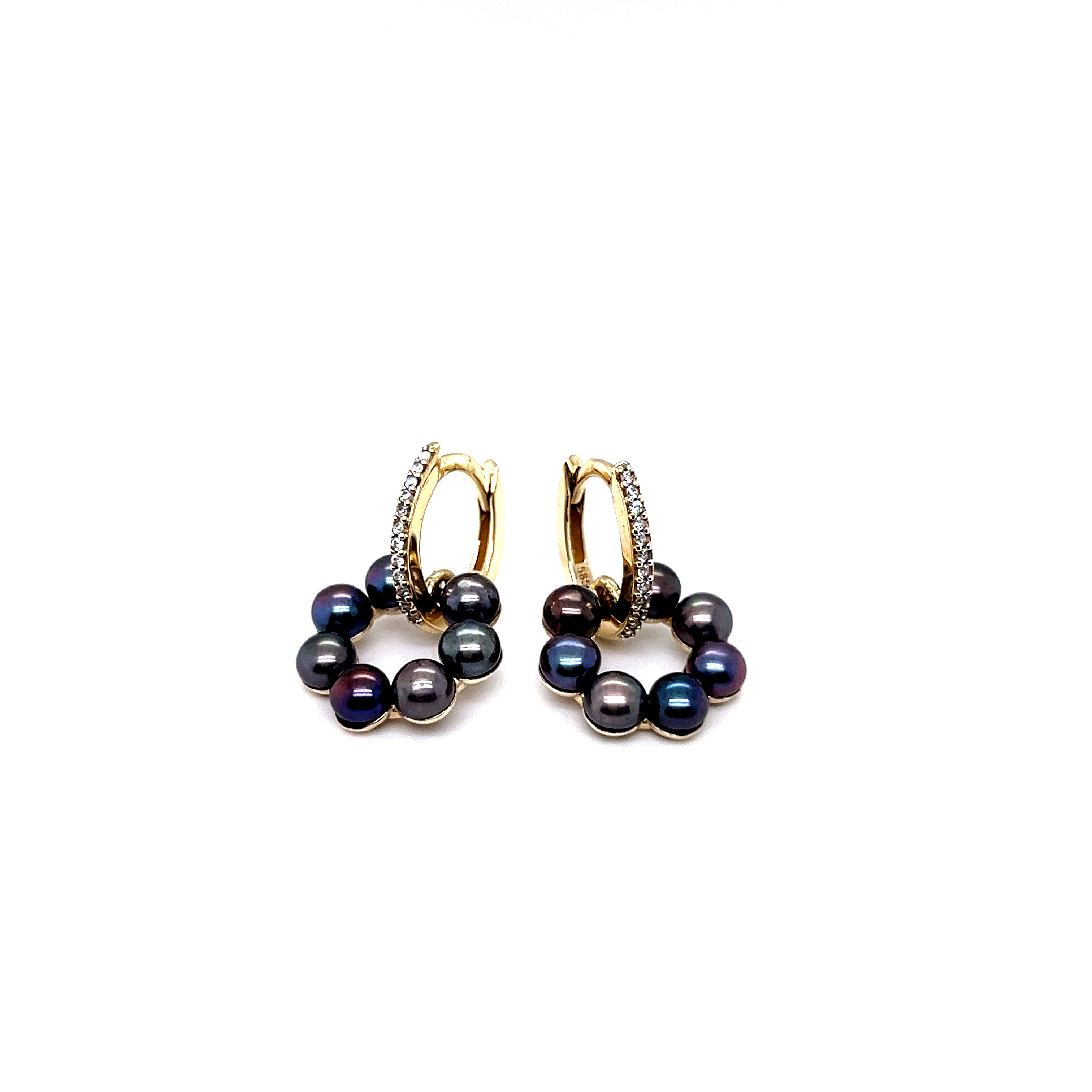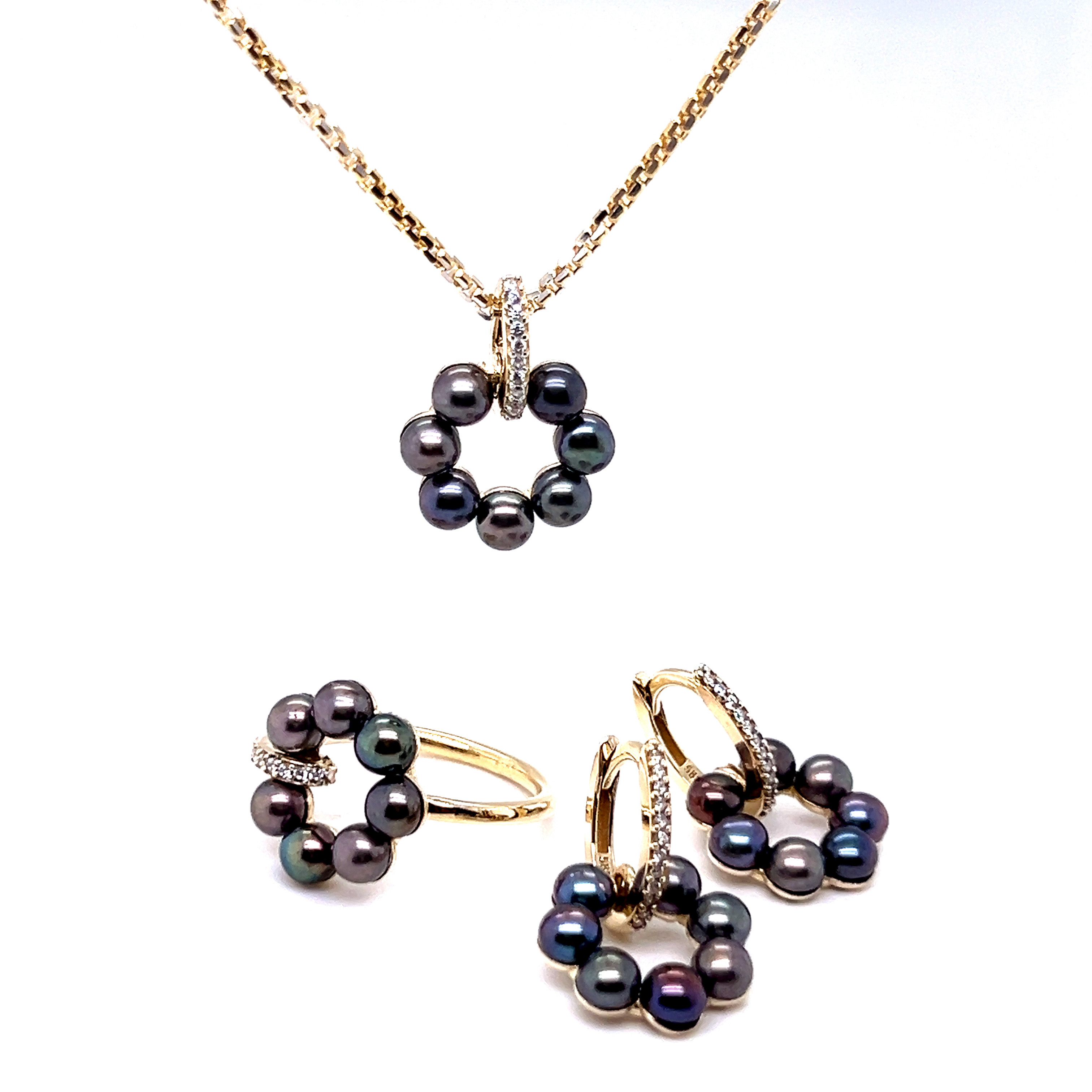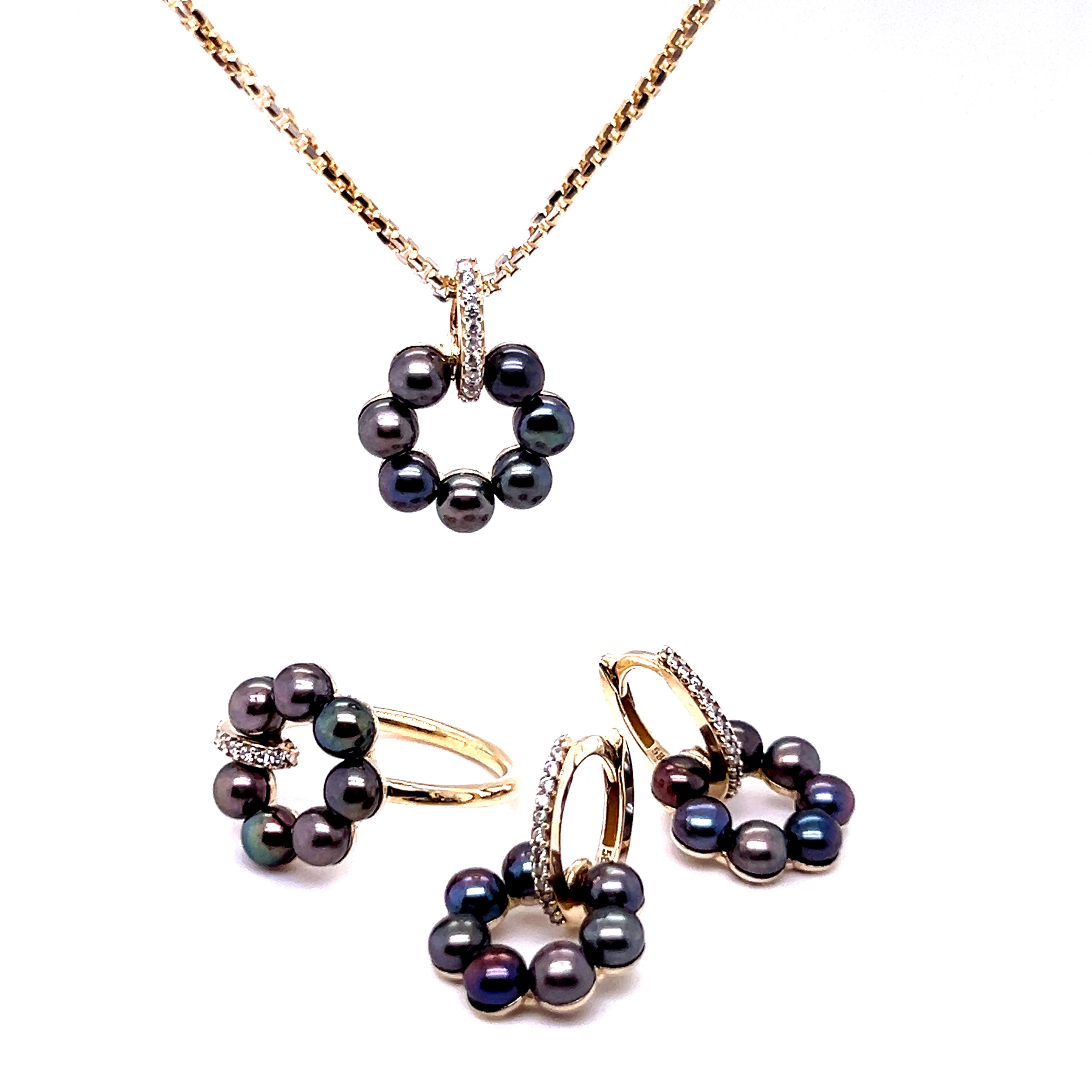 Комплект от “Jacklin hugasian” в жълто злато с тъмни перли и циркони.