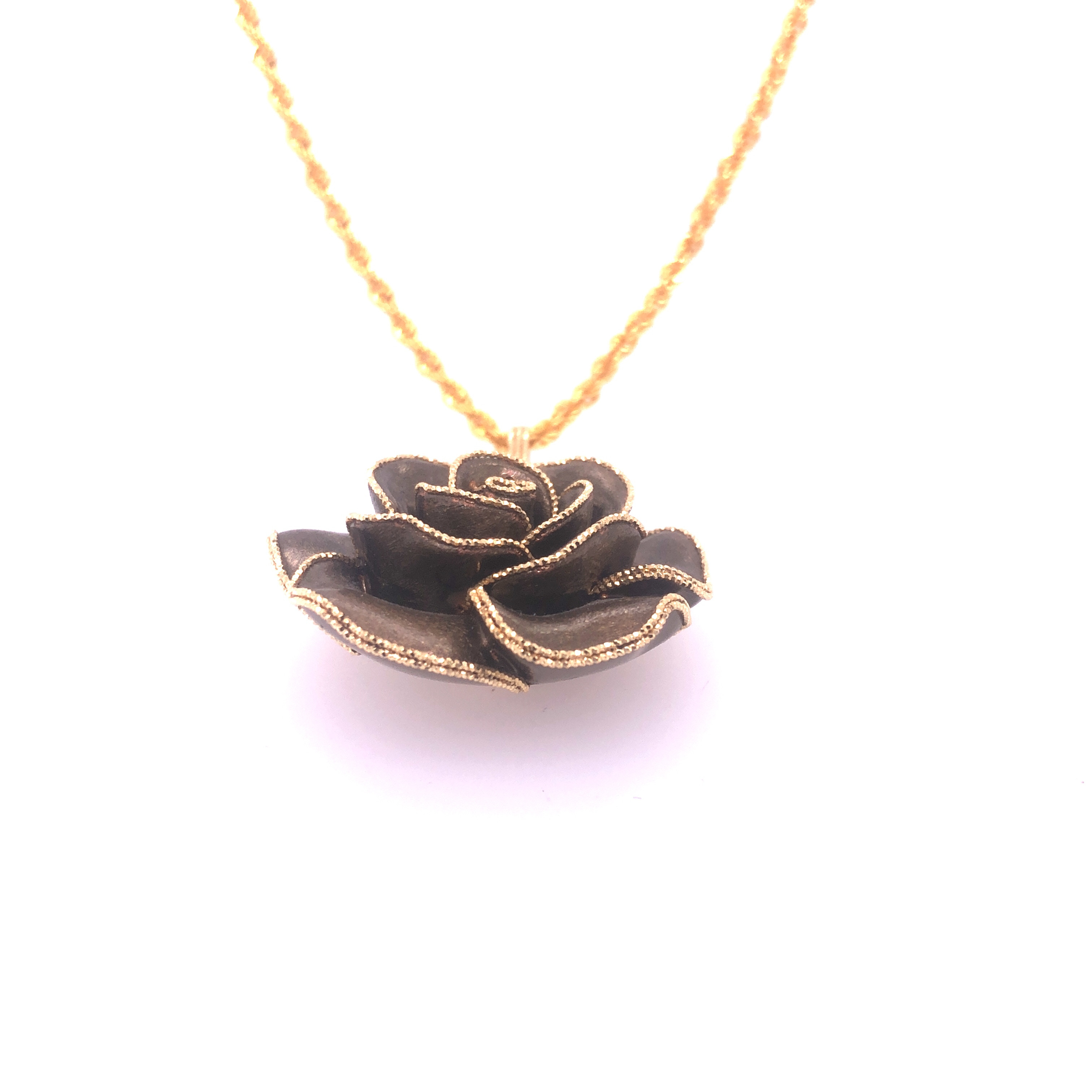 Колие от “Jacklin hugasian” в жълто и кафяво златo гланц, с лазерна шлифовка. Дължина 45 см., диаметър медальон 3.0 см. 14 К 585 Грам : 11.80 гр.