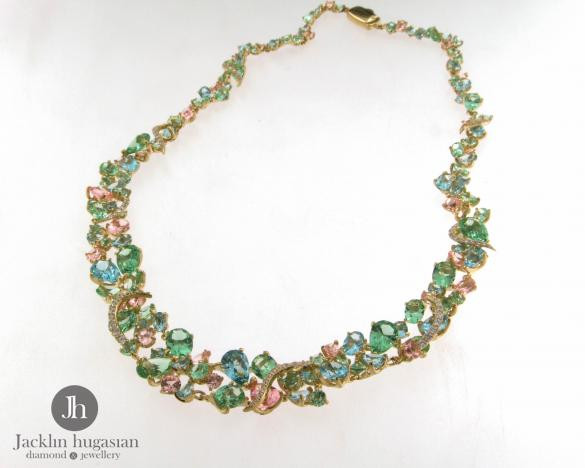 Колие от" Jacklin hugasian " сребро с позлата - цирконии, син и зелен топаз и розов кварц.Дьлжина колие 48 см.