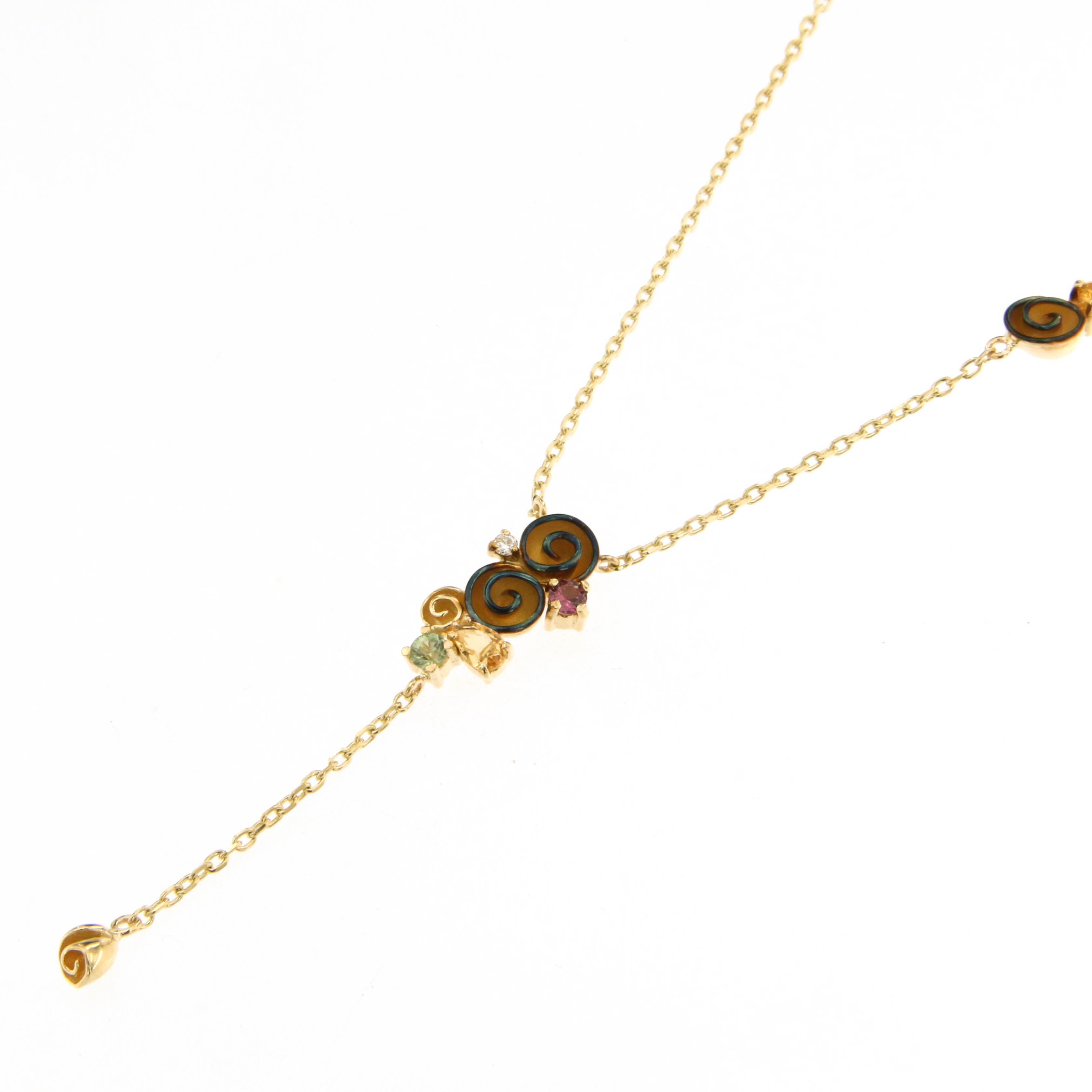 Колие от “Jacklin hugasian” жълто злато с диамант, розов и зелен сапфир, цитрин.