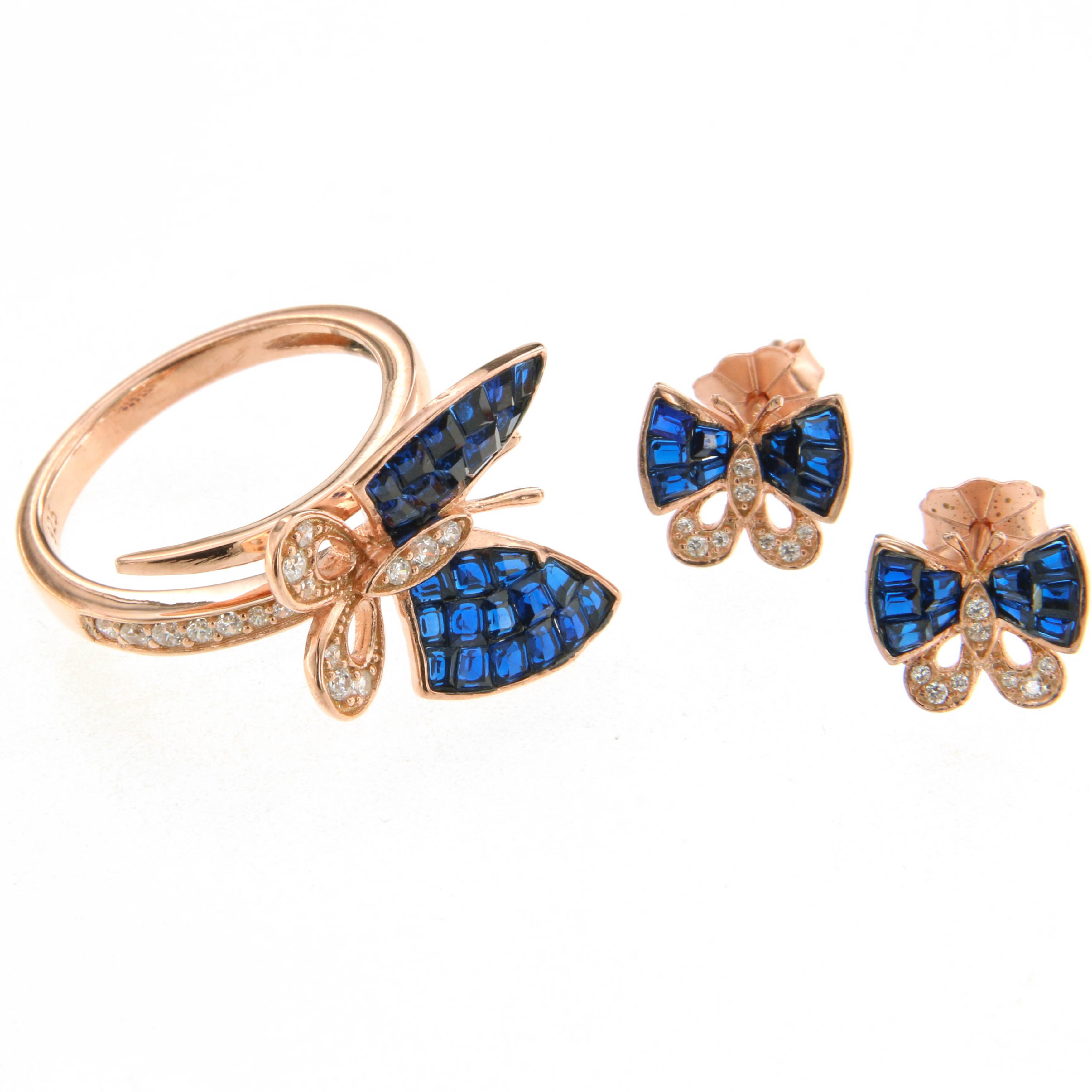 Комплект “Пеперуда” пръстен и обеци от “Jacklin ” в розово сребро с циркони и сапфир | Jacklin hugasian