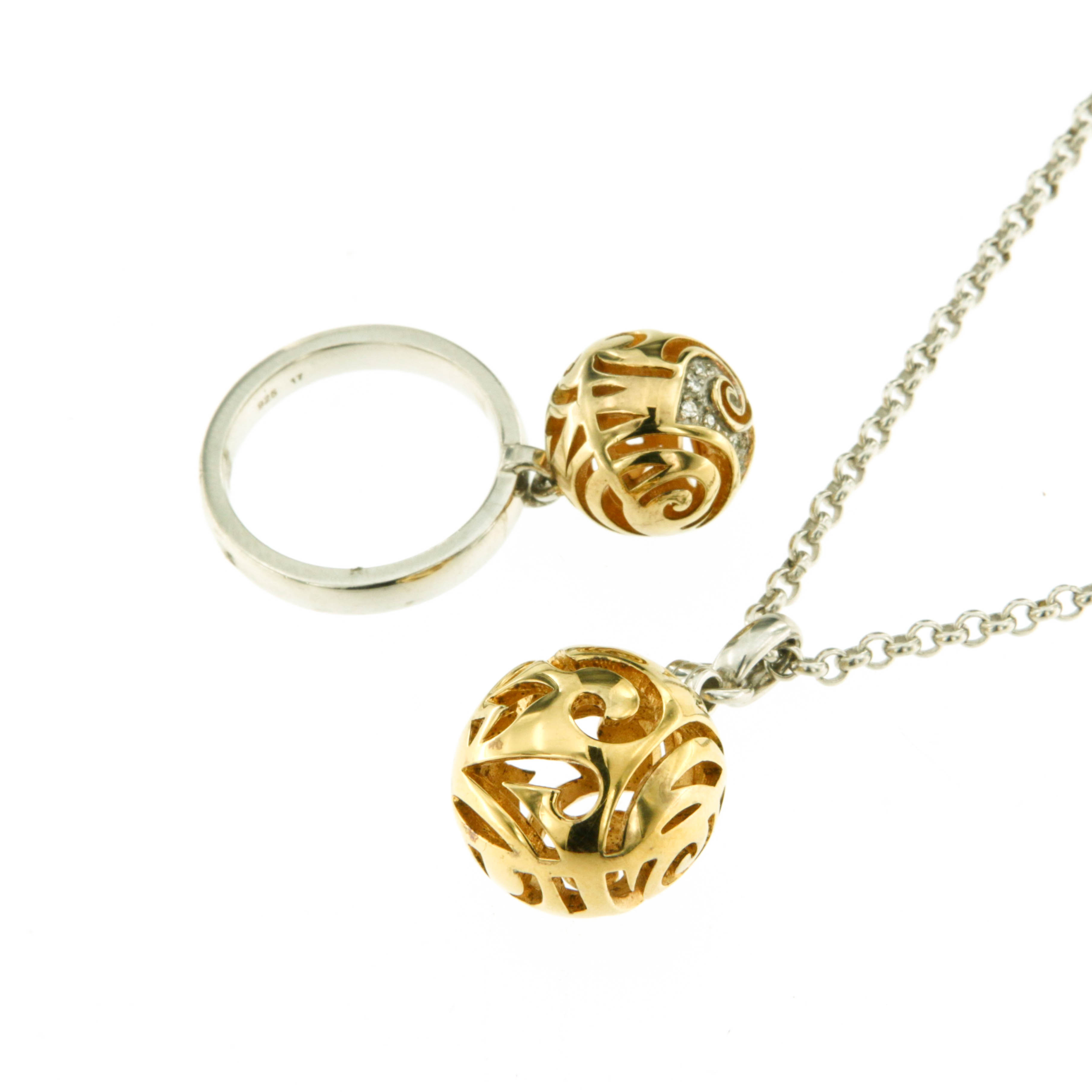 Комплект пръстен и колие от "Jacklin hugasian" в сребро с жълта позлата и цирконии. Дължина колие 45 см./ с удължител/. Пръстенът е с подвижна горна част.