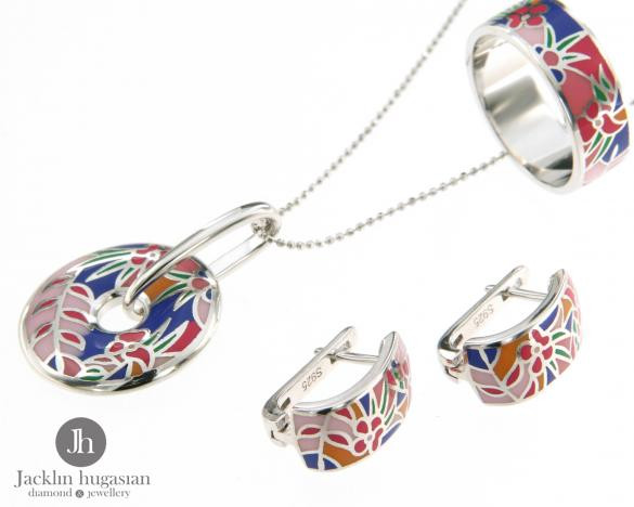 Комплект пръстен, колие и обеци от "Jacklin hugasian" в сребро с разноцветен емайл. Дължина колие 50 см. Дължина обеци 1.7 см., широчина обеци 0.7 см. Колекция "TITI".
