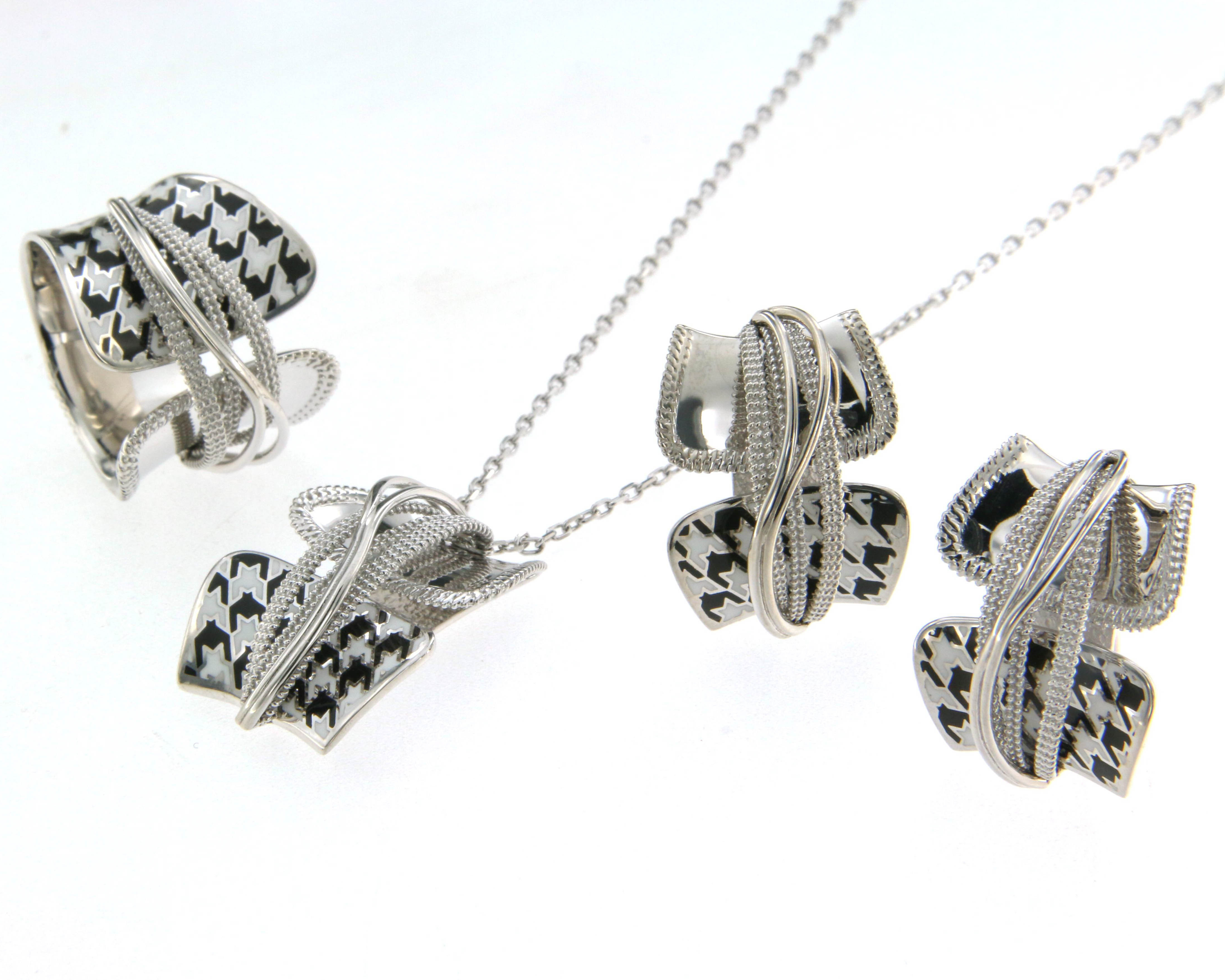 Комплект пръстен и обеци от "Jacklin hugasian" в сребро с цветен емайл и лазерна шлифовка.