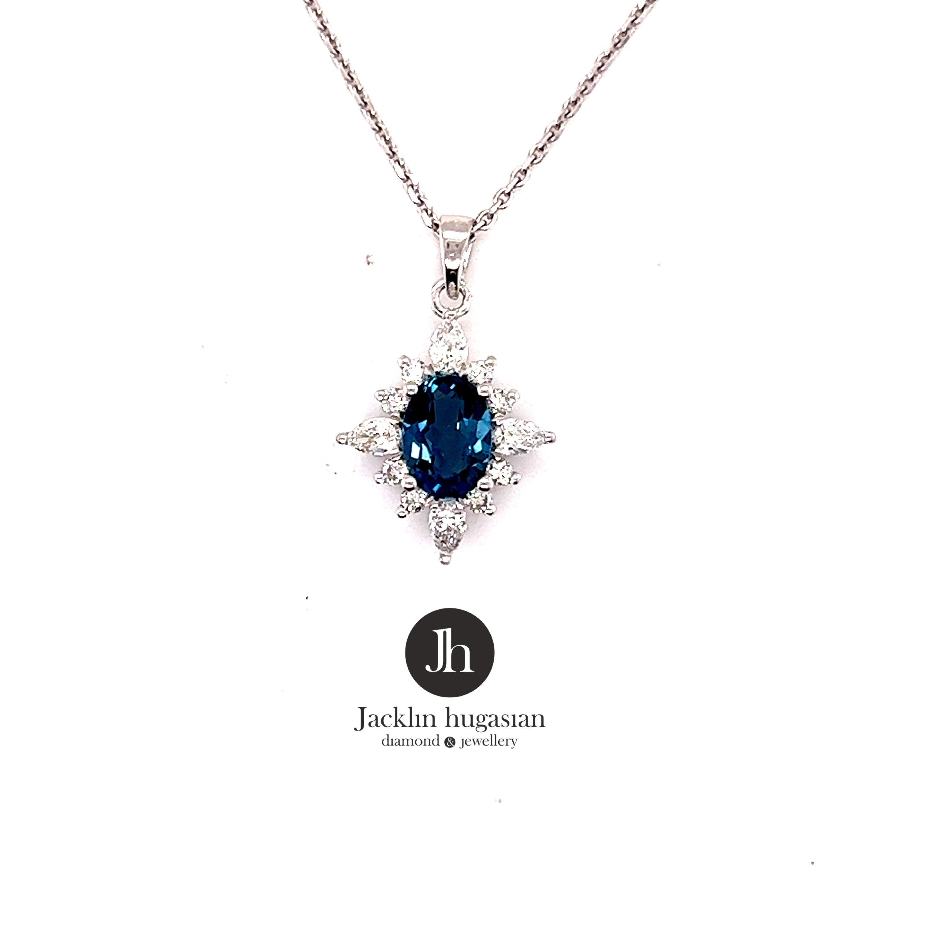 Обеци от “Jacklin hugasian” в бяло злато с лондон топаз и диаманти.