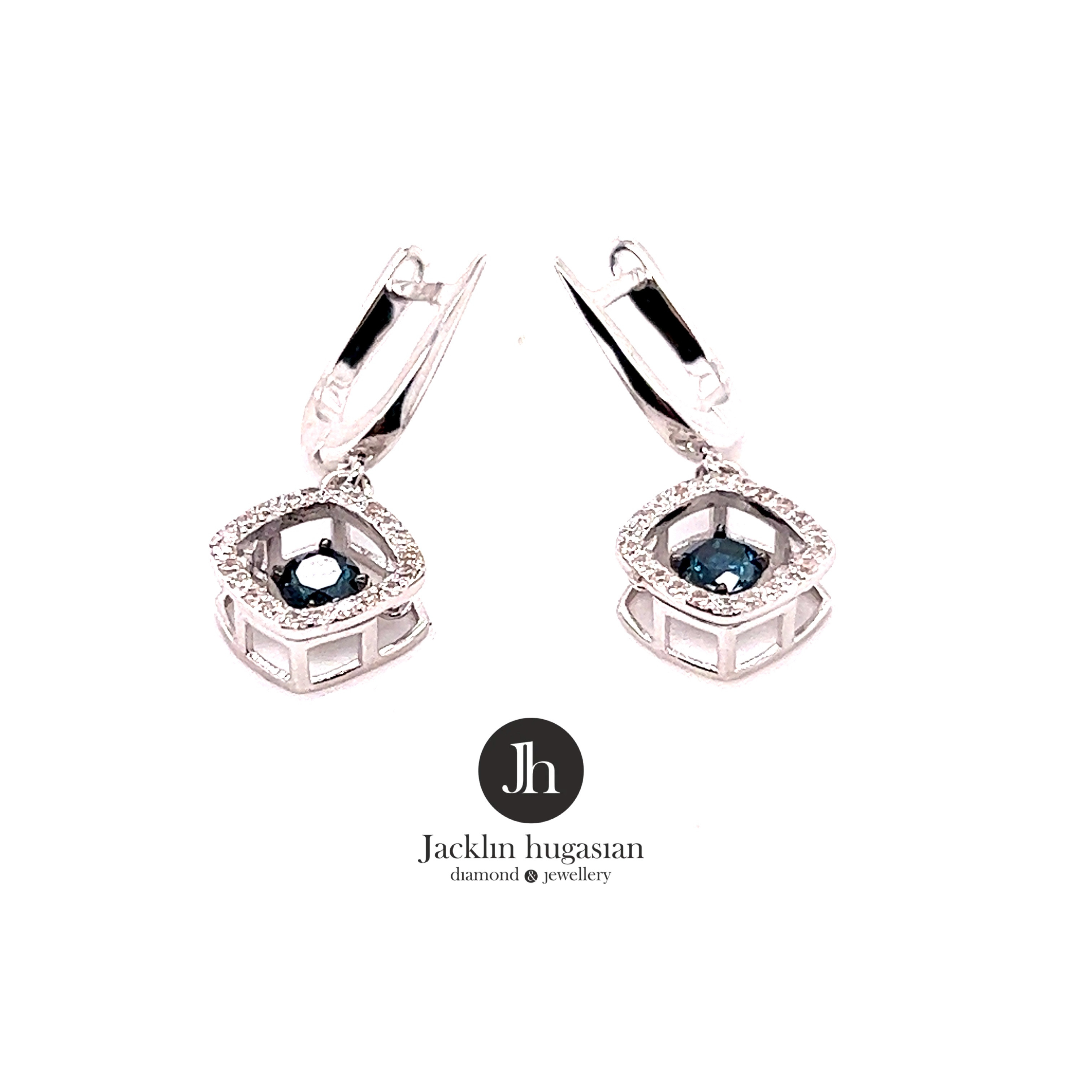 Обеци от “Jacklin hugasian” в бяло злато със сини и бели диаманти.