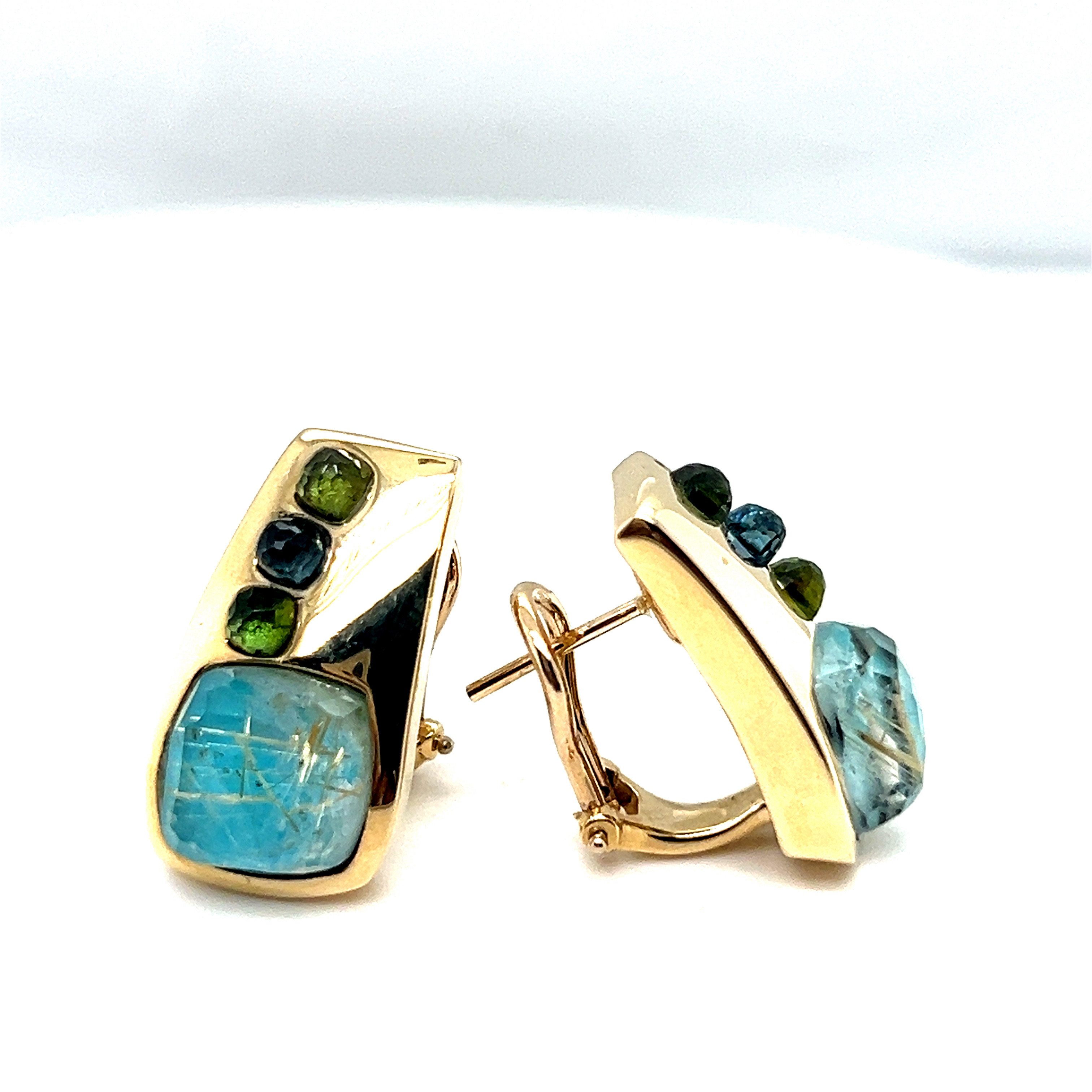 Обеци от “Jacklin hugasian” в жълто злато с "Косите на Венера",перидот и топаз