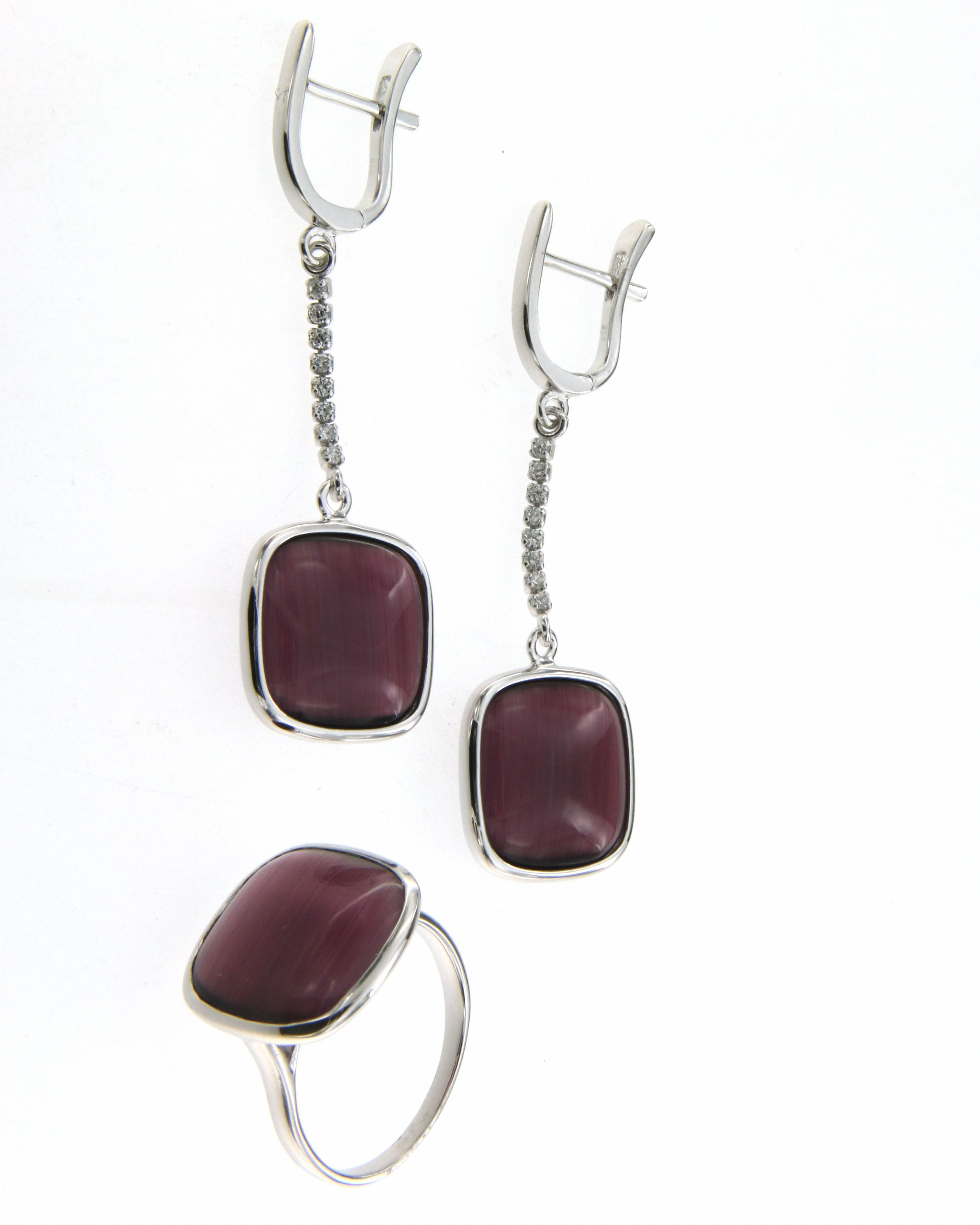 Обеци и пръстен от "Jacklin hugasian" в сребро с камък "Котешко око" и циркони.