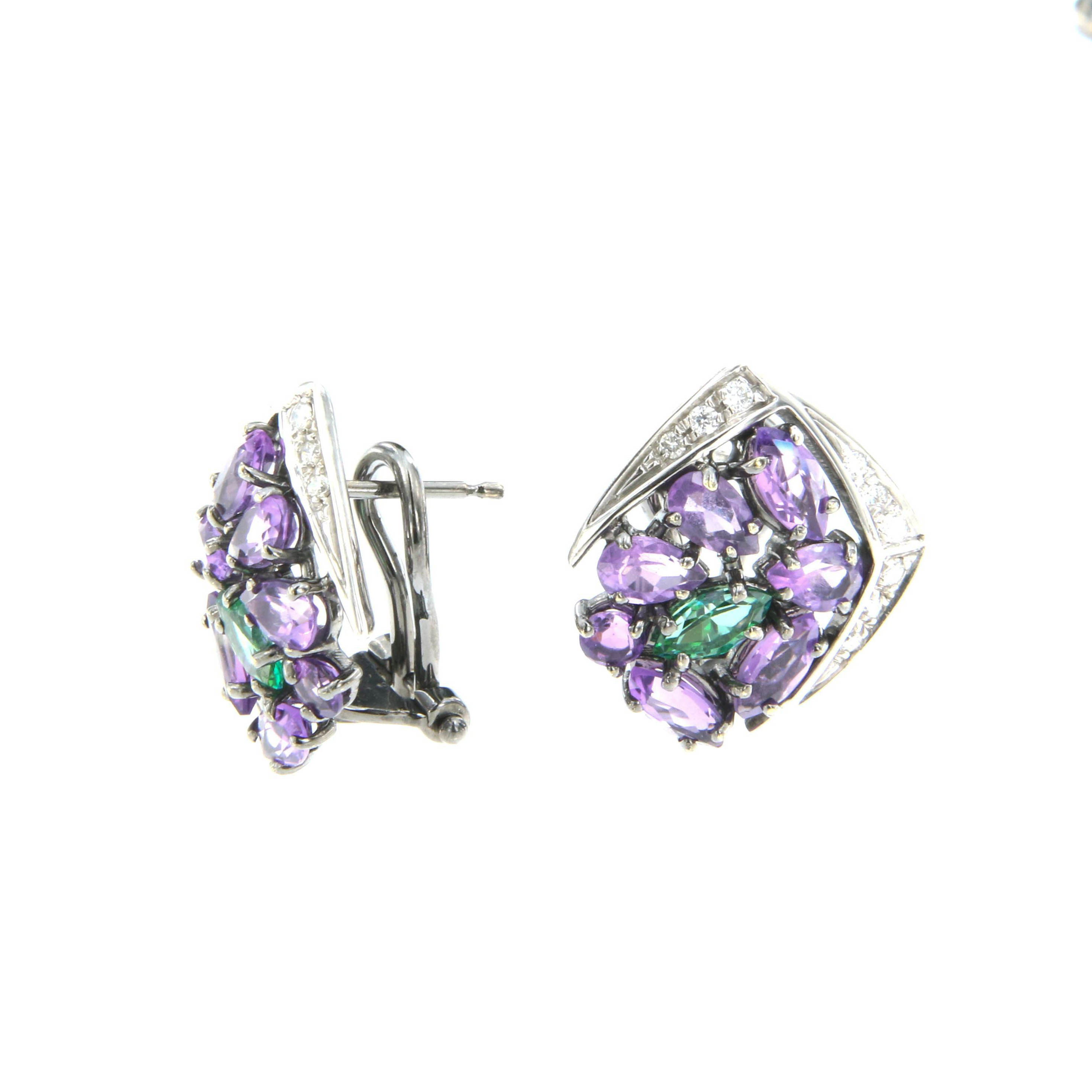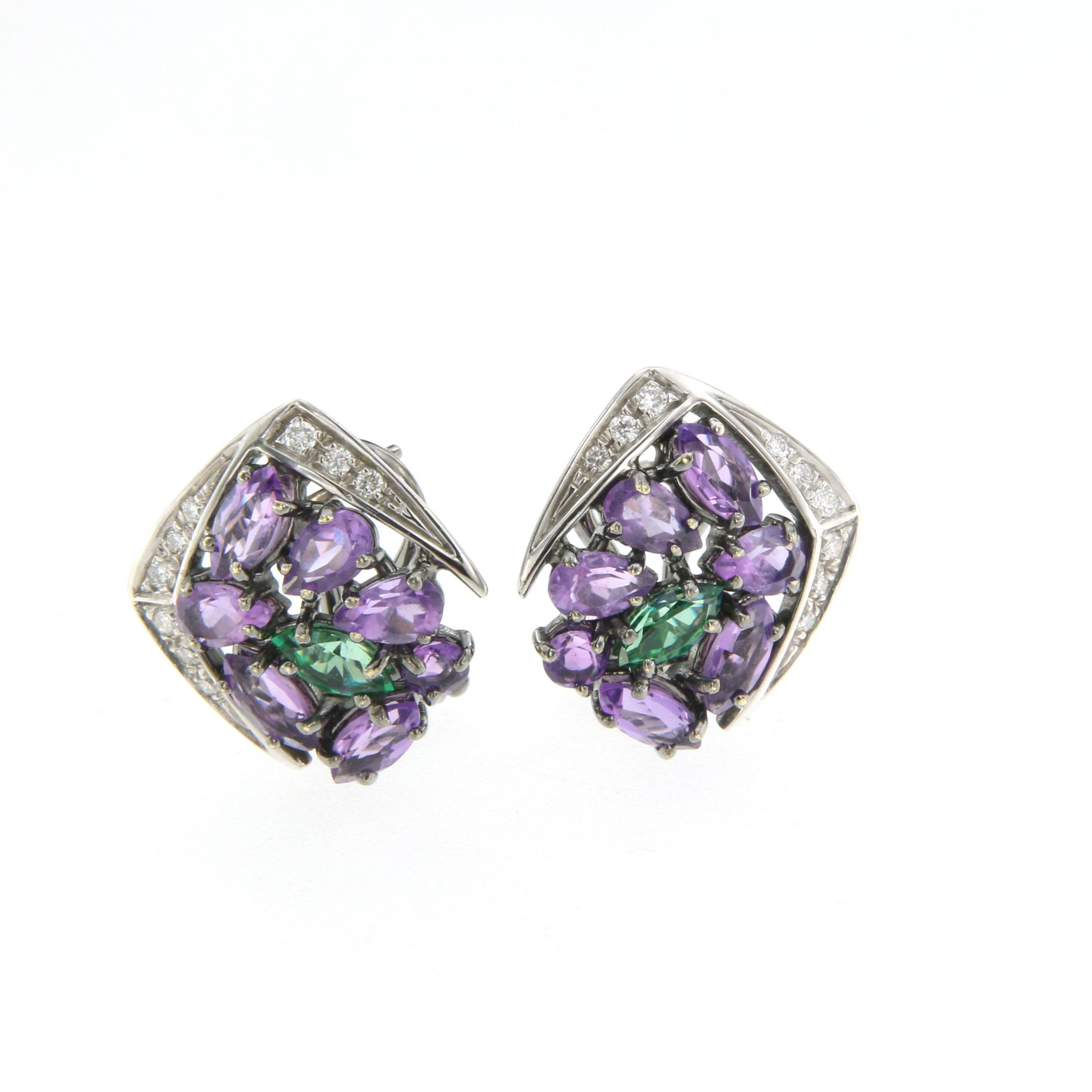Обеци от “Jacklin hugasian” черно злато с диаманти, аметист и турмалин. Дължина 2,0 см, широчина 2.0 см. Колекция “Roberto Bravo”. Произход Италия