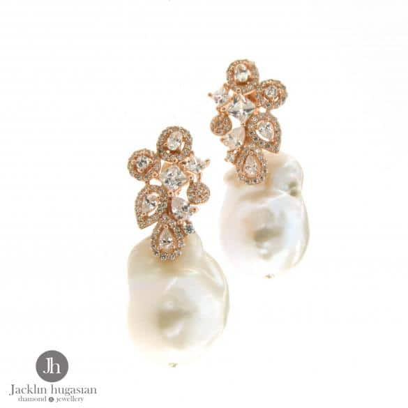 Обеци от " Jacklin hugasian " в розово сребро с цирконий и перла. Дължина обеци 3.5 см., широчина 1.5см.