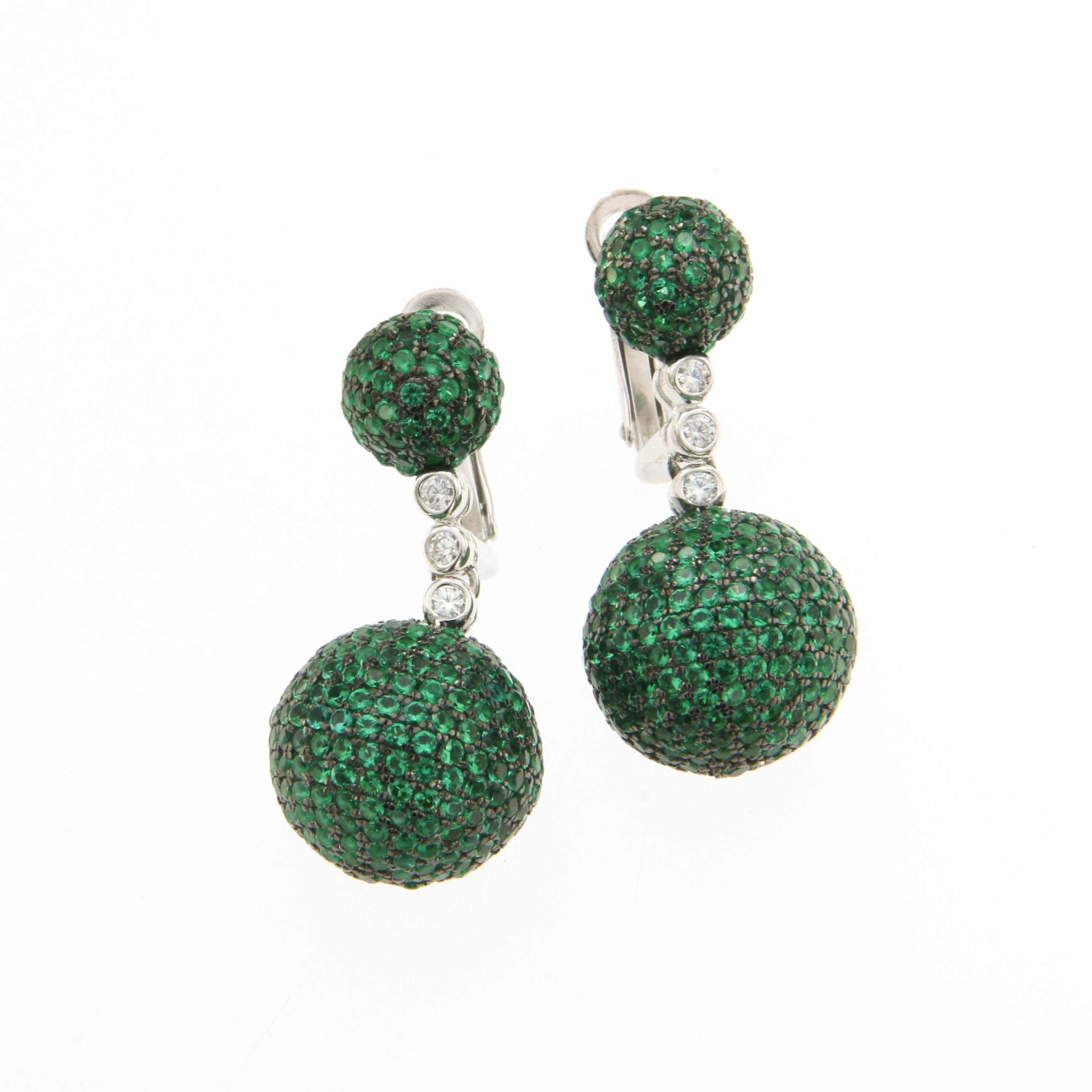 Обеци от “Jacklin hugasian” в сребро с цирконии и зелен изумруд. Дължина обеци 2.5 см., широчина 1.3 см.