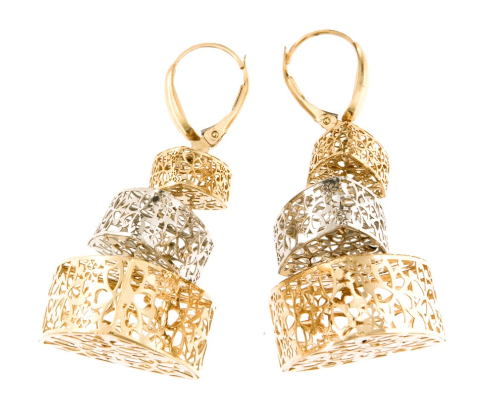 Обеци от "Jacklin hugasian" в жълто и бяло злато гланц филиграмна изработка триъгълна форма. Дължина обеци 4.5 см, широчина 2.00 см. Произход Италия.