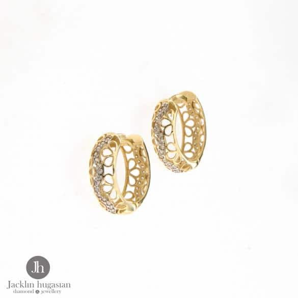 Обеци от " Jacklin hugasian " в жълто злато,гланц с цирконии,олекотени.Дължина обеци 1.5 см.,широчина обеци 0.5 см.